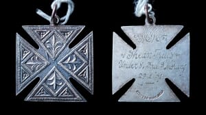 Most of these items are from a local source – ‘Lady M. Macmillan’, who won the Australian Sterling Silver awards for her Highland Dancing in the 1950’s! The magnificent Scottish basket-hilted sword was her ‘Dancing Sword’, and bears her initials. The Scottish ‘sword dance’ required two of these, which were placed crossed at right angles, forming four quarters: it was the moving into & out of these quarters that made up this unique Scottish ‘Sword Dance’. She won these in various regional Victorian Highland Dancing events, and seems to have favoured the ‘Highland Fling’.