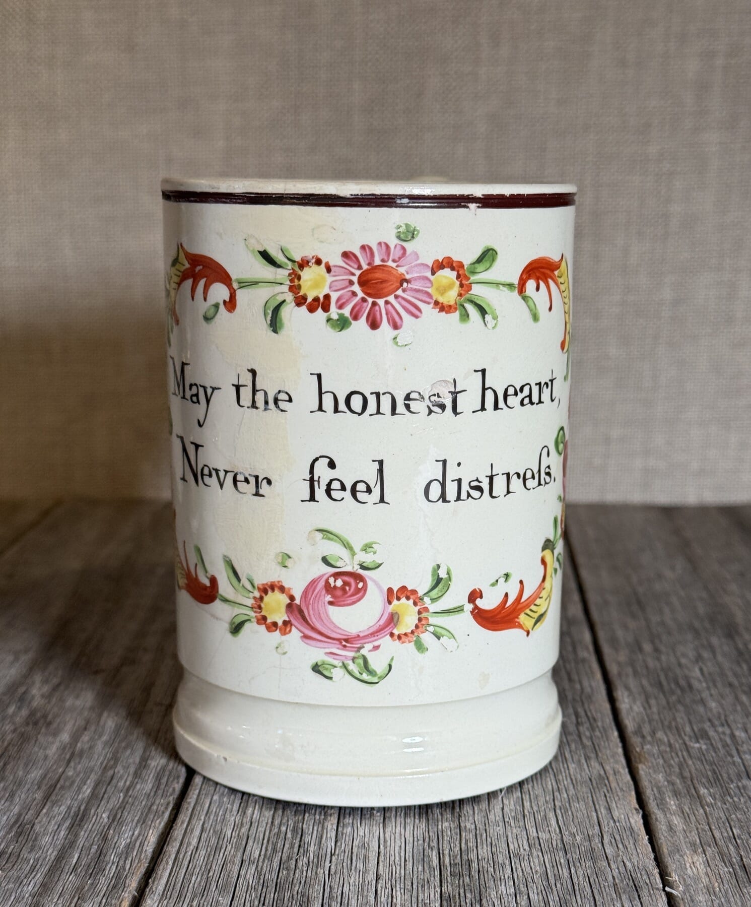Creamware frog mug, of straight-sided tankard form, painted with “May the honest heart never feel distress” within a flower wreath…