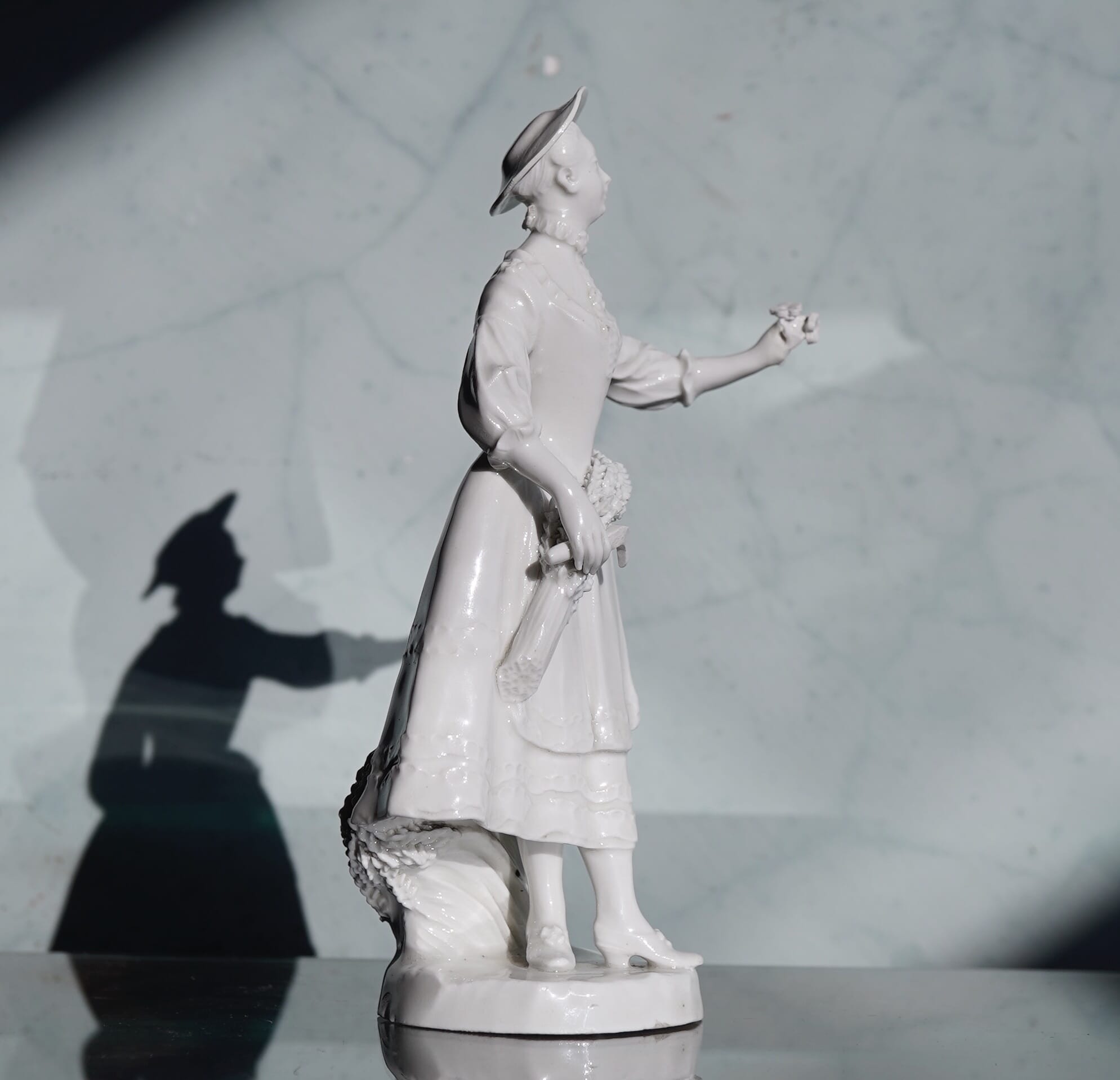 Delightful early Vienna figure of a lady ‘Harvester’, modelled smartly dressed with ribbon around her neck to keep her broad…
