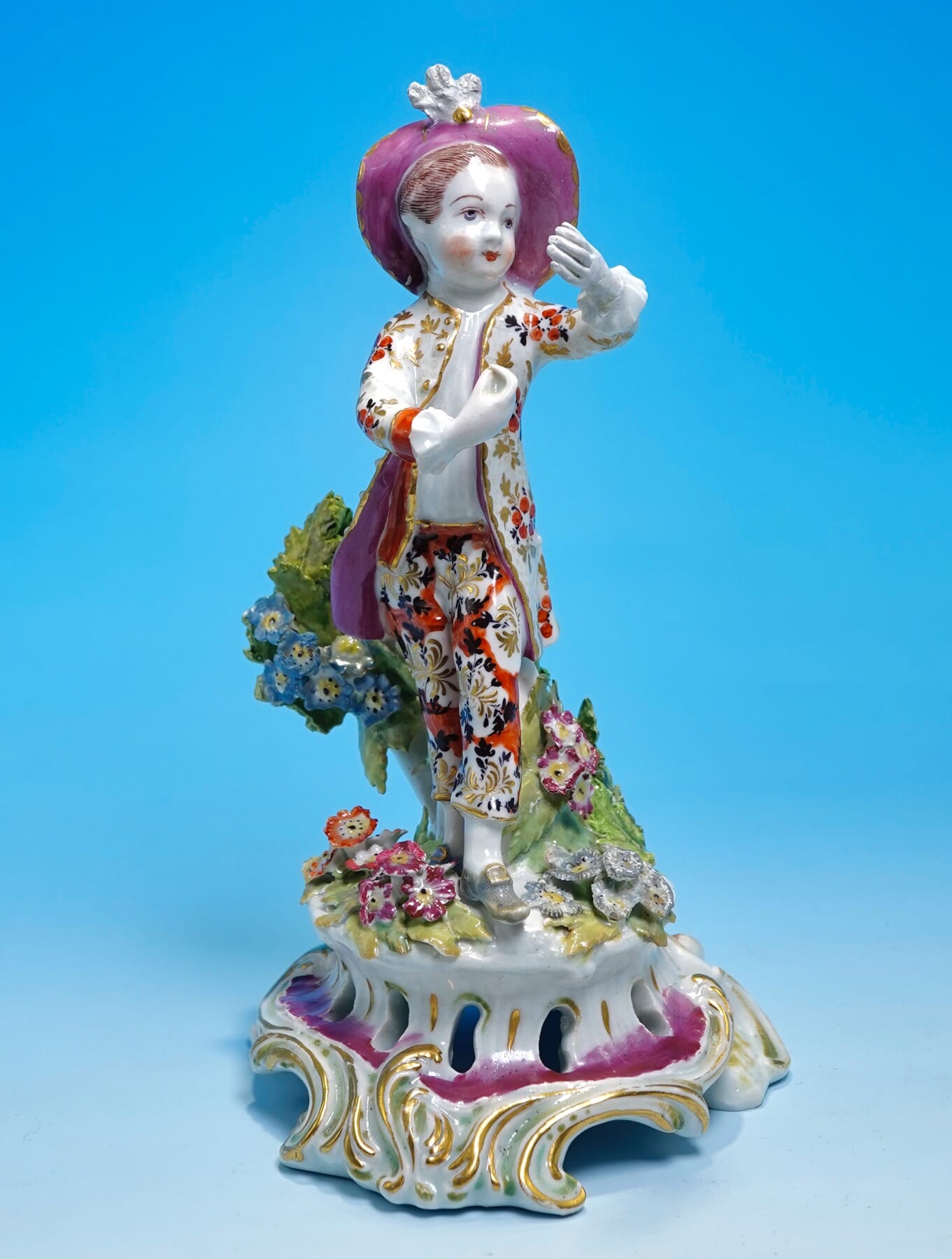 Bow ‘New Dancer’ boy on rococo scroll base, ‘Red Anchor’ mark, c. 1765