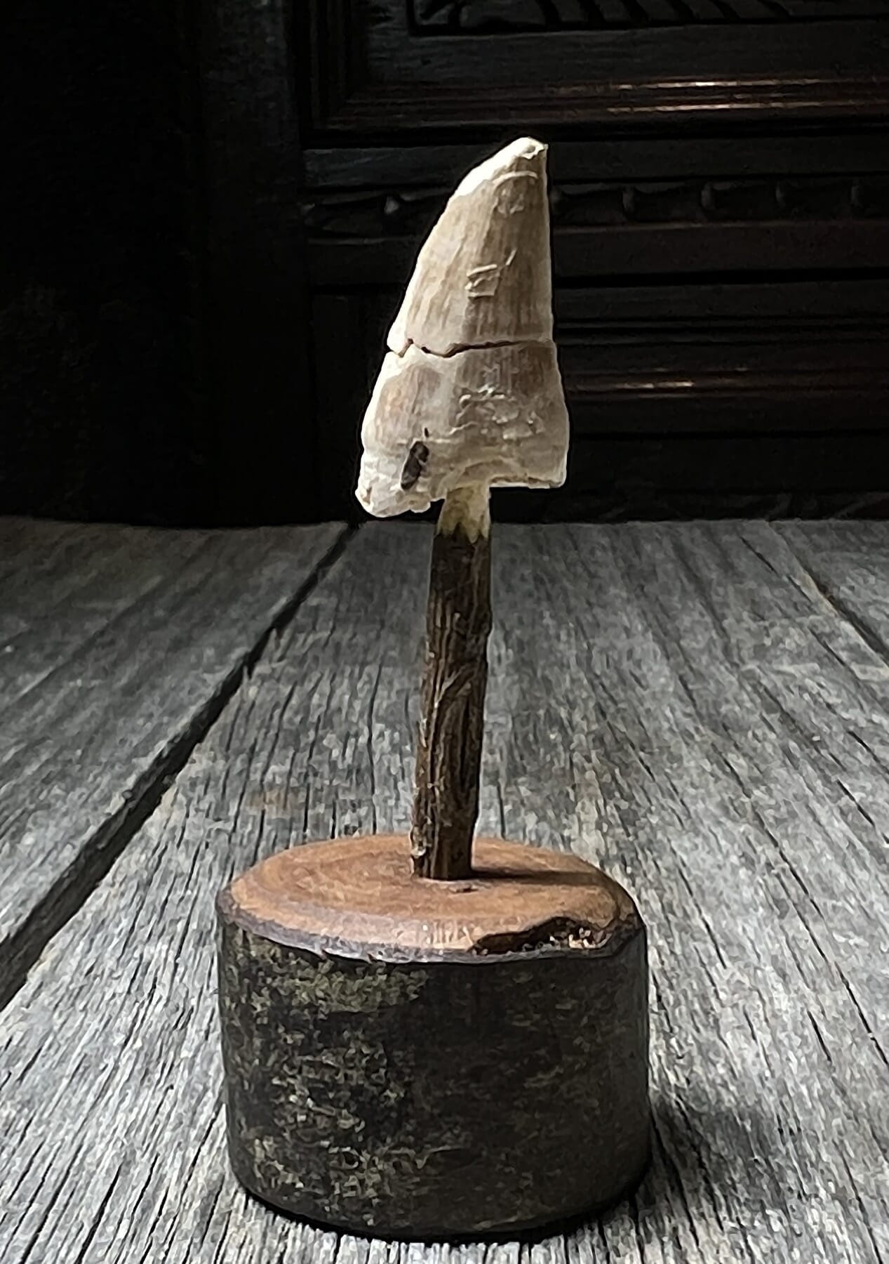 Mosasaur tooth, mounted on a wood base, 100-66 million years old
