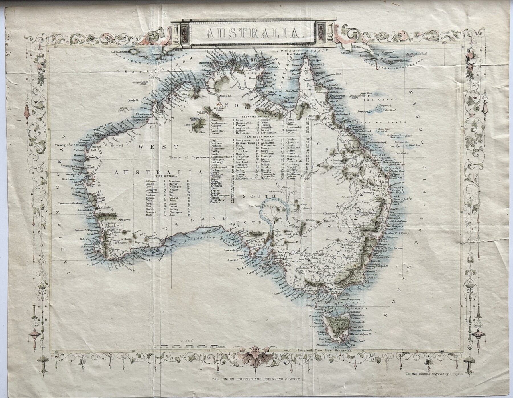 Hand Coloured Australia map, after John Tallis ‘Great Exhibition’ map, 1860’s