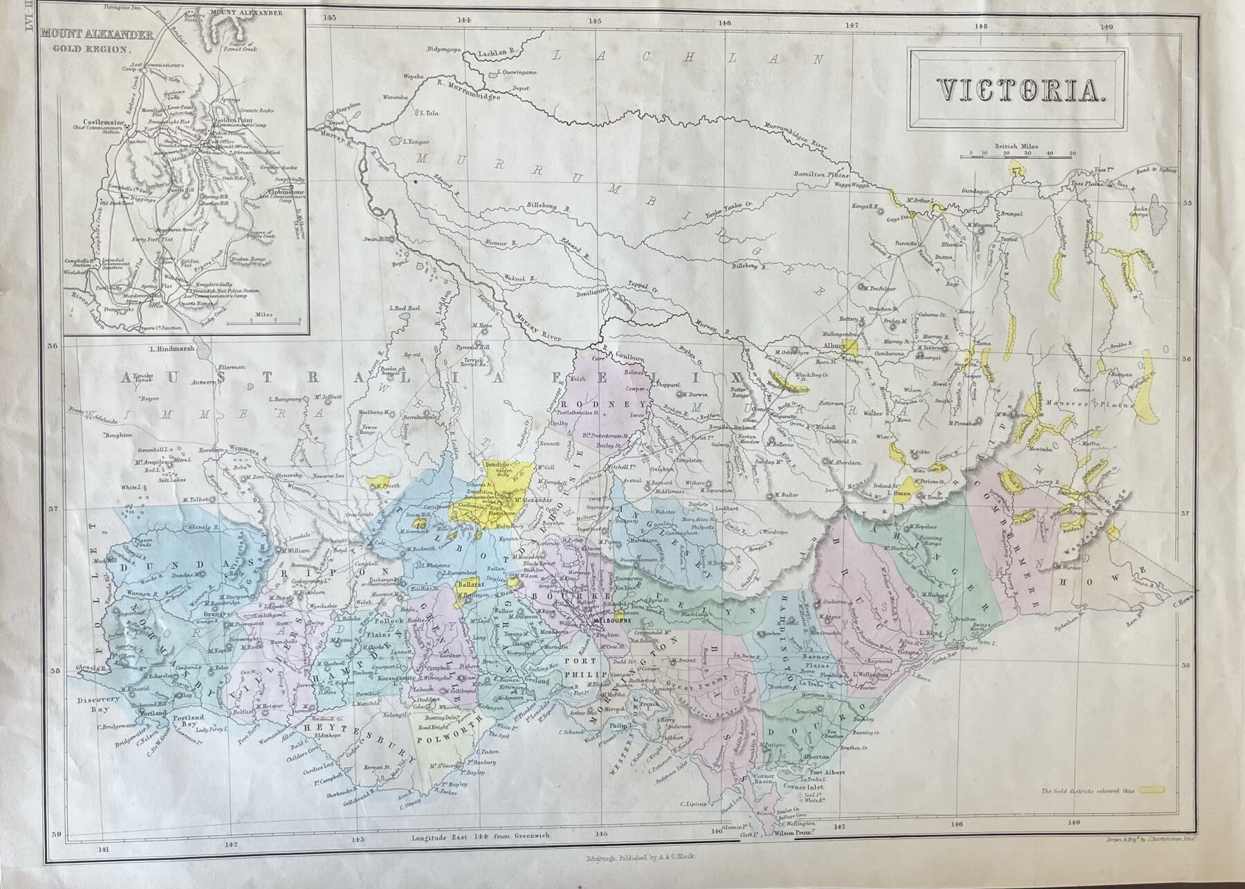 Victoria Goldfields print, showing Counties, with close-up of Goldfields, published Edinburgh 1854
