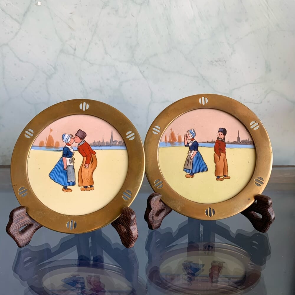 Pair of Dutch pottery plaques, painted figures in brass frames c.1910
