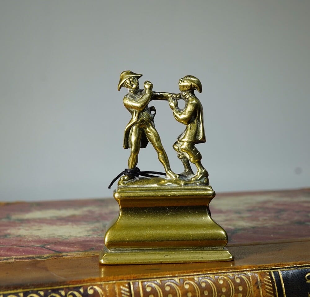 Brass miniature chimney ornament, comical fighting figures, earlier 19th century