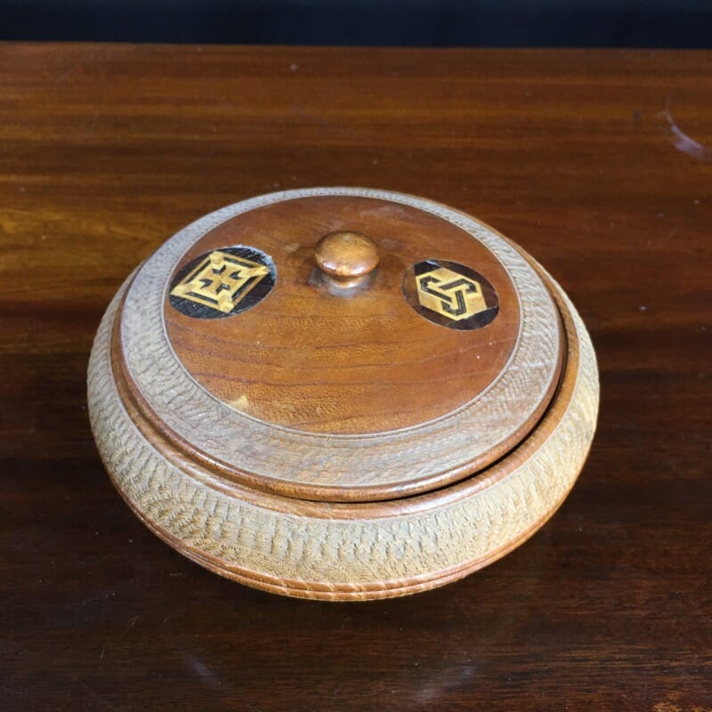 Japanese lidded circular wooden box, inlay to lid