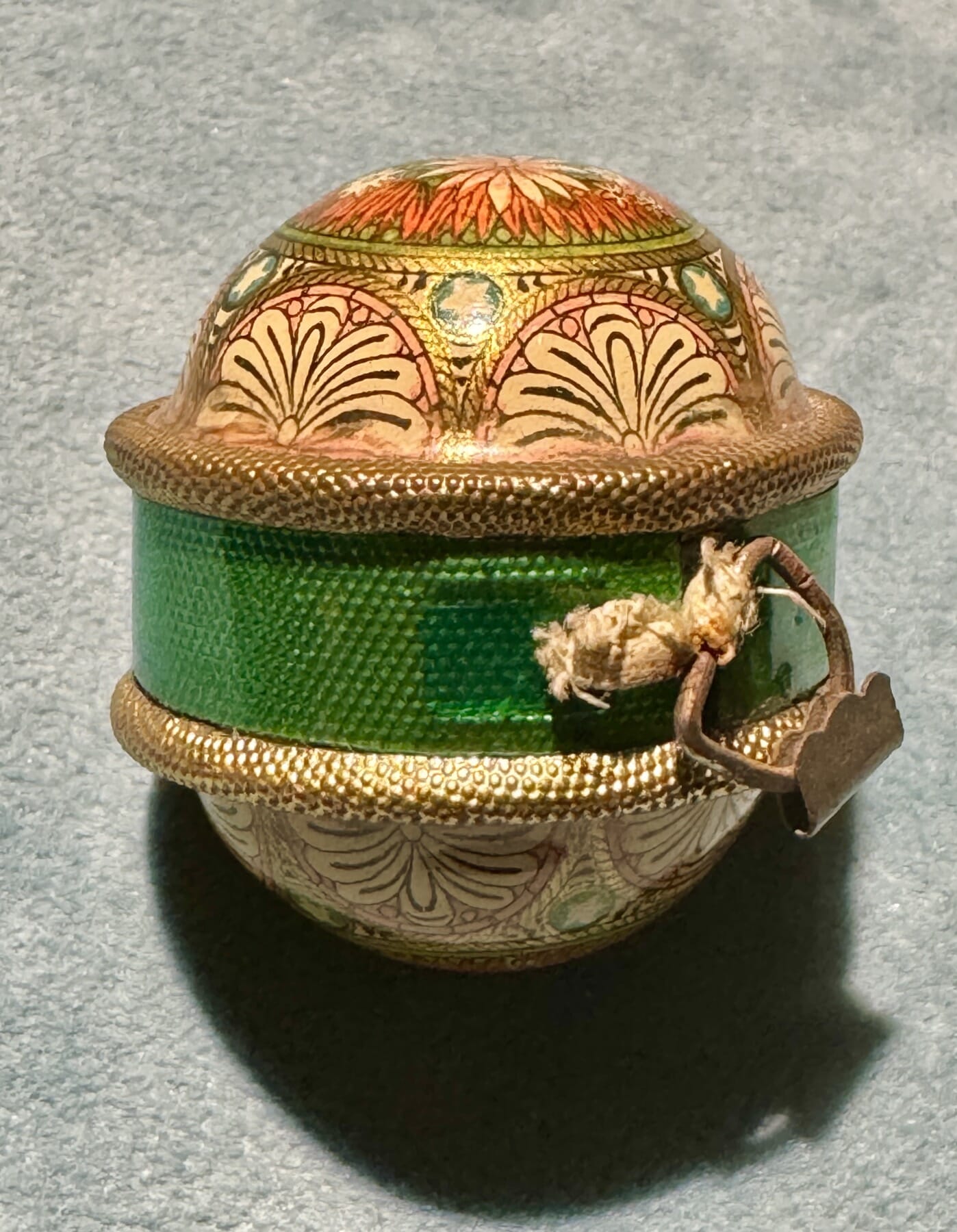 Victorian tapemeasure, ‘exotic’ printed + painted domes + enamel, c. 1900