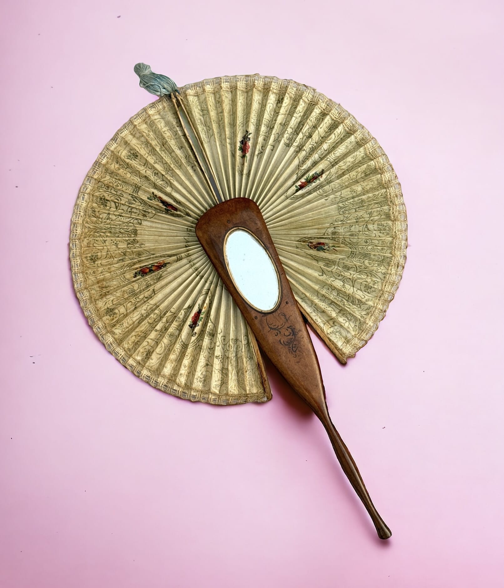 Unusual Victorian fan with olive wood case & mirror, slide-out concertina round face, swallow painted, c. 1880