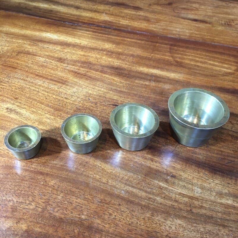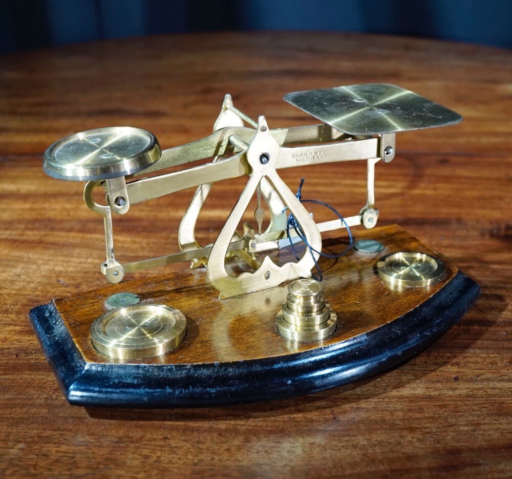 Superb set of brass scales with weights, ‘New’ in original box, c. 1900