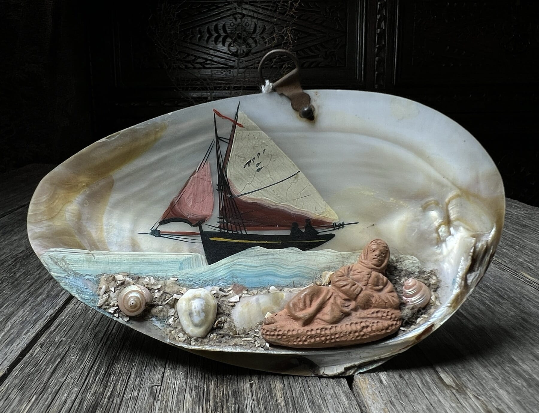 Mussel shell diorama, with terracotta fishwife & painted fishing boat, c.1890