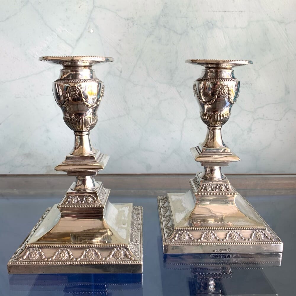 Pair of plated urn shaped candlesticks, H E & Co, c. 1880