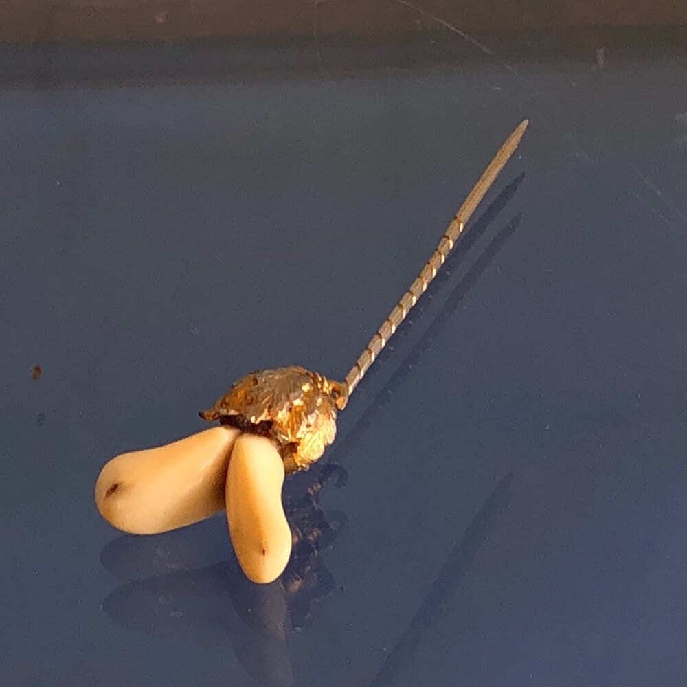 Grandeln Elk Tooth stick pin, oak leaves, silver gilt, c. 1870