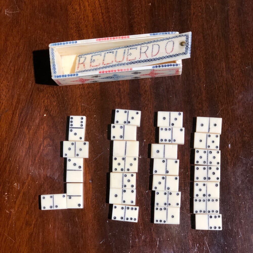 Spanish bone dominoes box & set, ‘RECUERDO’ 19th century