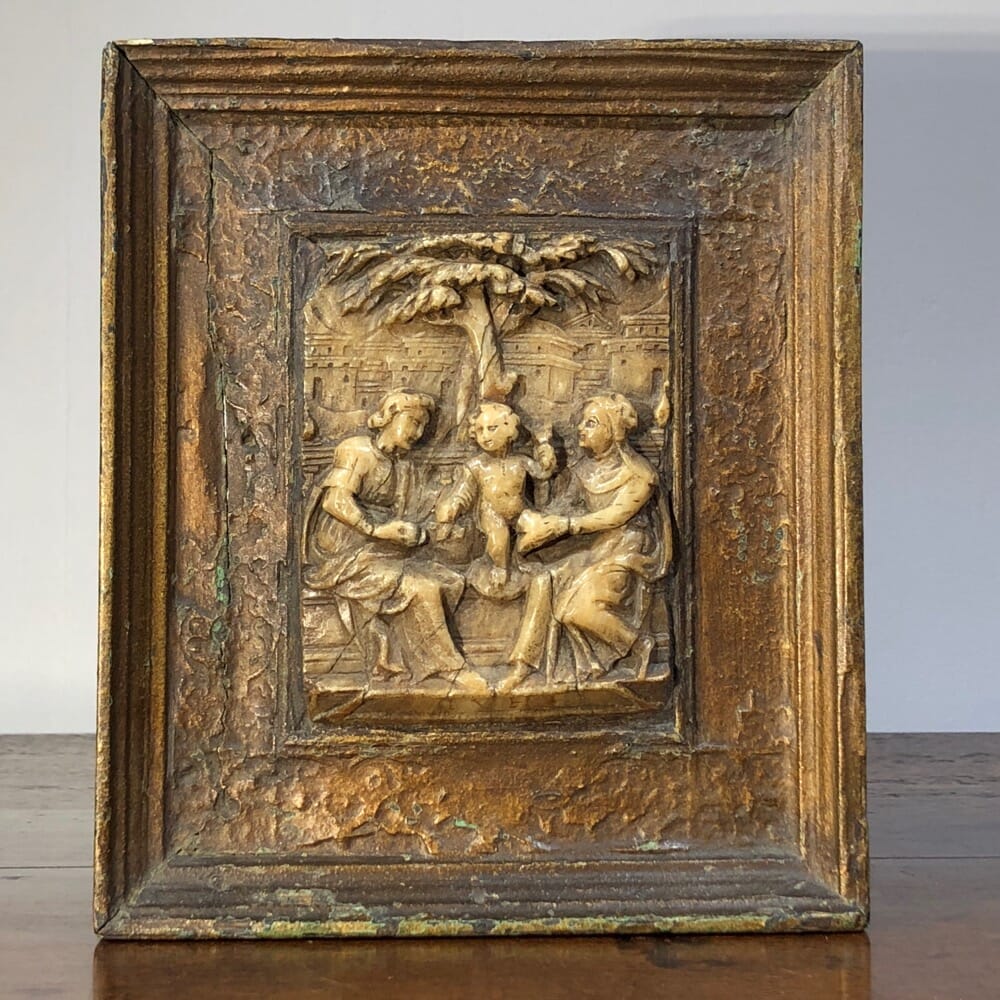 Flemish Alabaster carved & gilt plaque, Mary & Elizabeth with infant John, Mechelen (Malines) 17th century