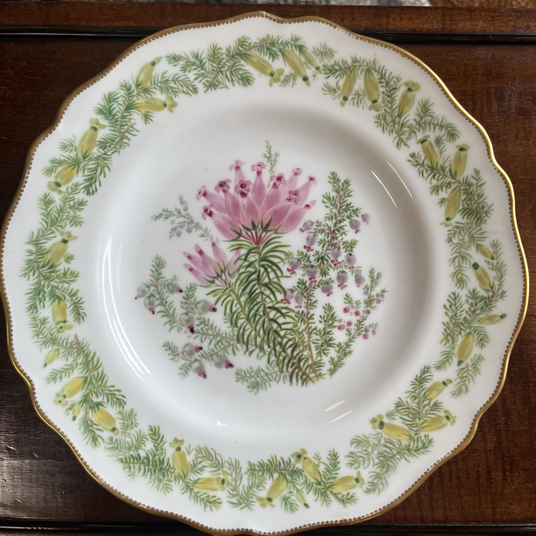 English porcelain plate, roses & gilt scrollwork in apple green border, c. 1825