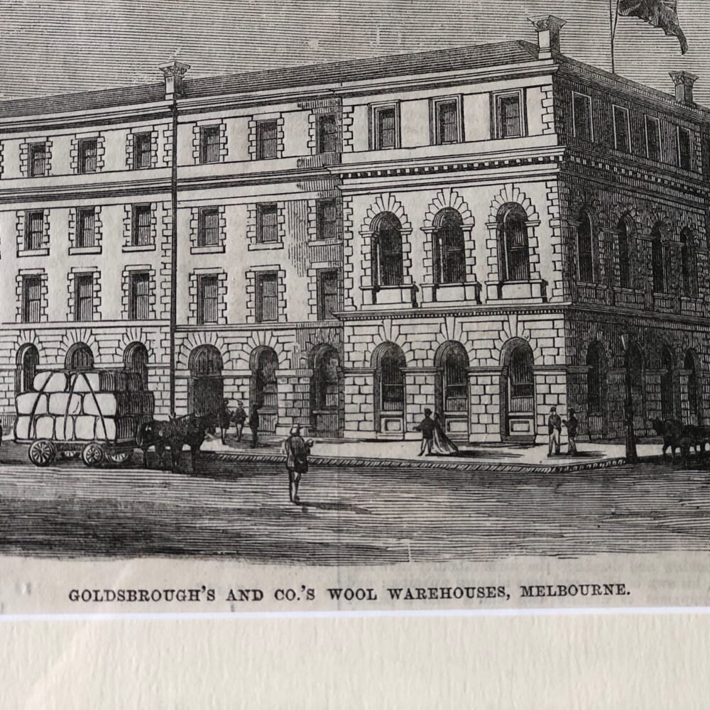 Framed print “GOLDSBROUGH’S AND CO.’S WOOL WAREHOUSES, MELBOURNE 19th C