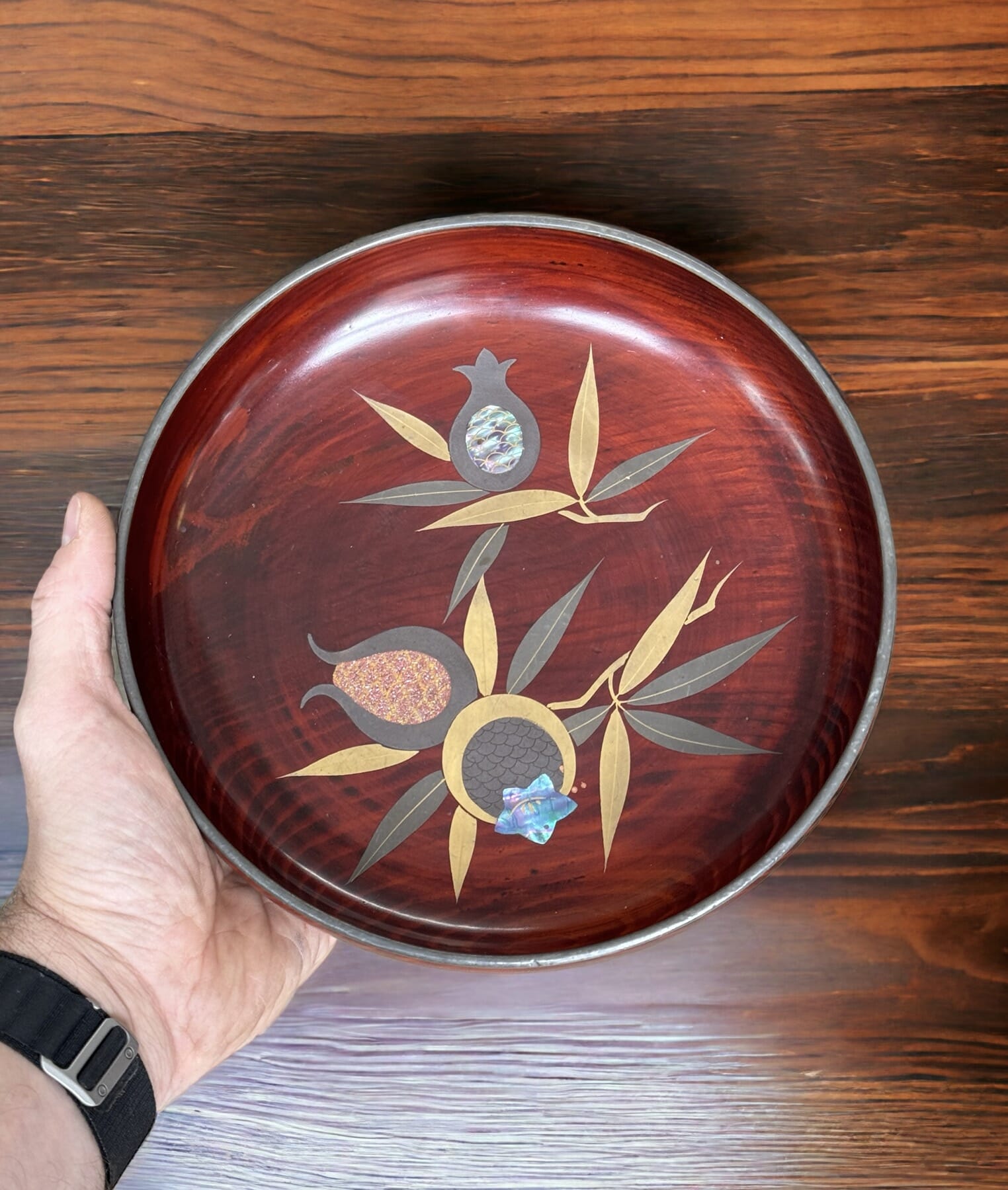 Japanese wood bowl with lacquer + inlaid paua ‘pomegranates’, c. 1920