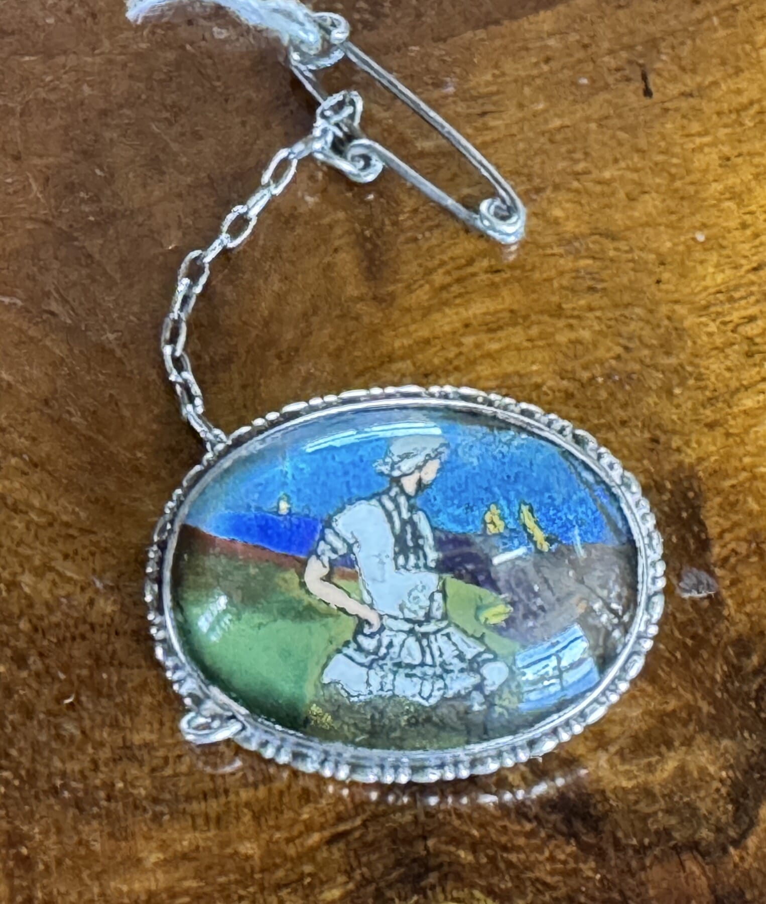 Hand Painted & Butterfly Wing ‘Dutch Girl’ brooch, Sterling Silver mounts, c. 1925