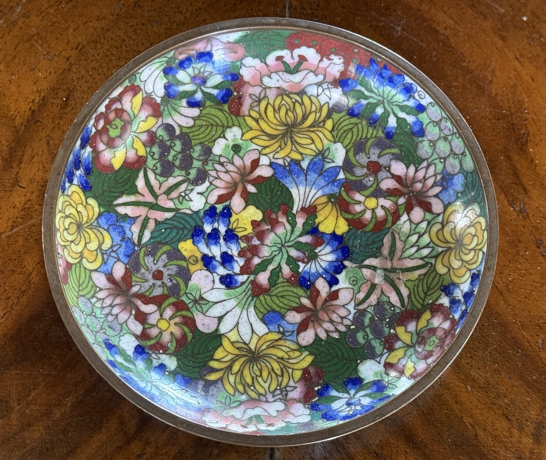 Finely detailed Chinese Cloisonné dish, chrysanthemum flowers, c. 1900