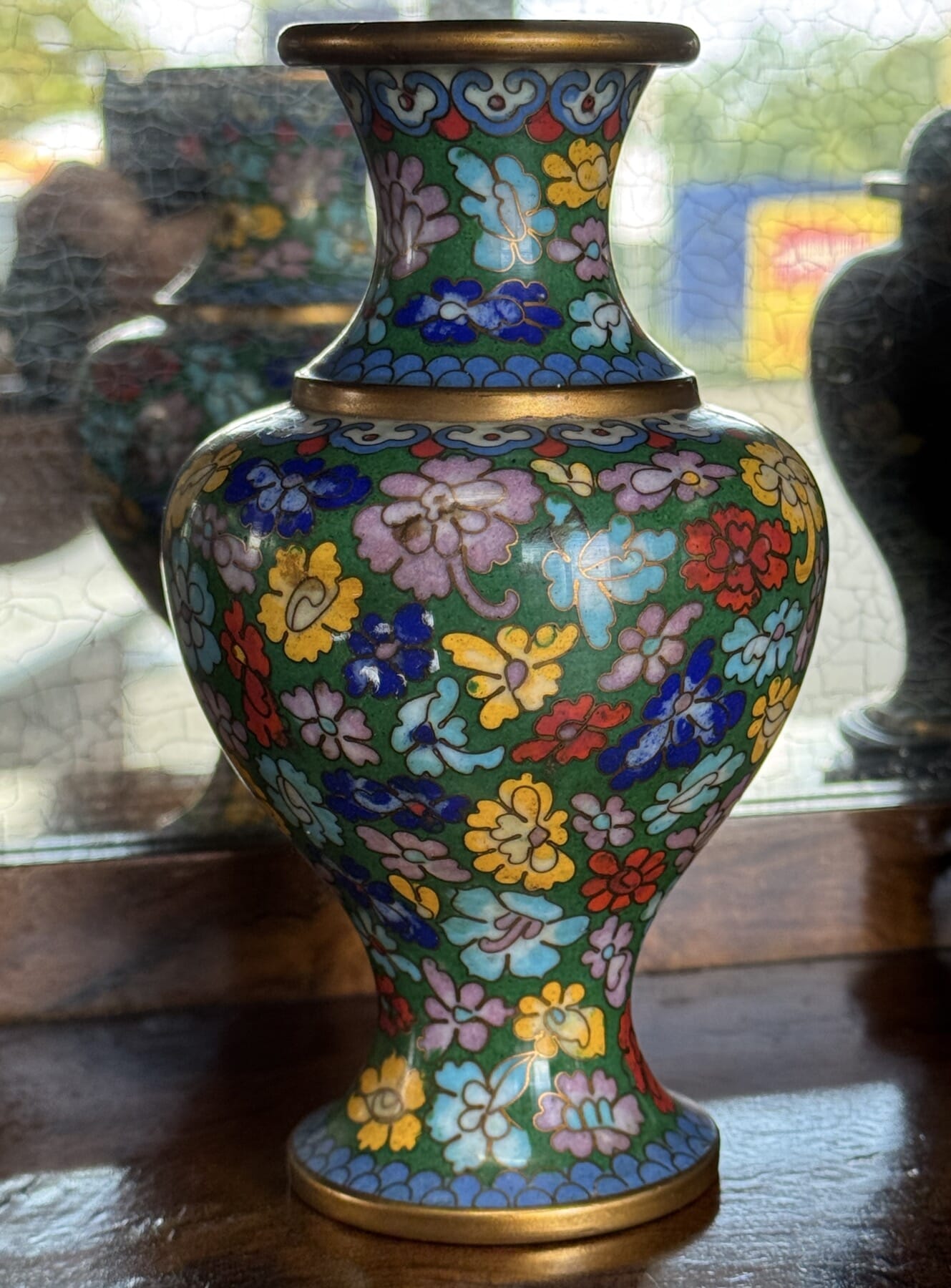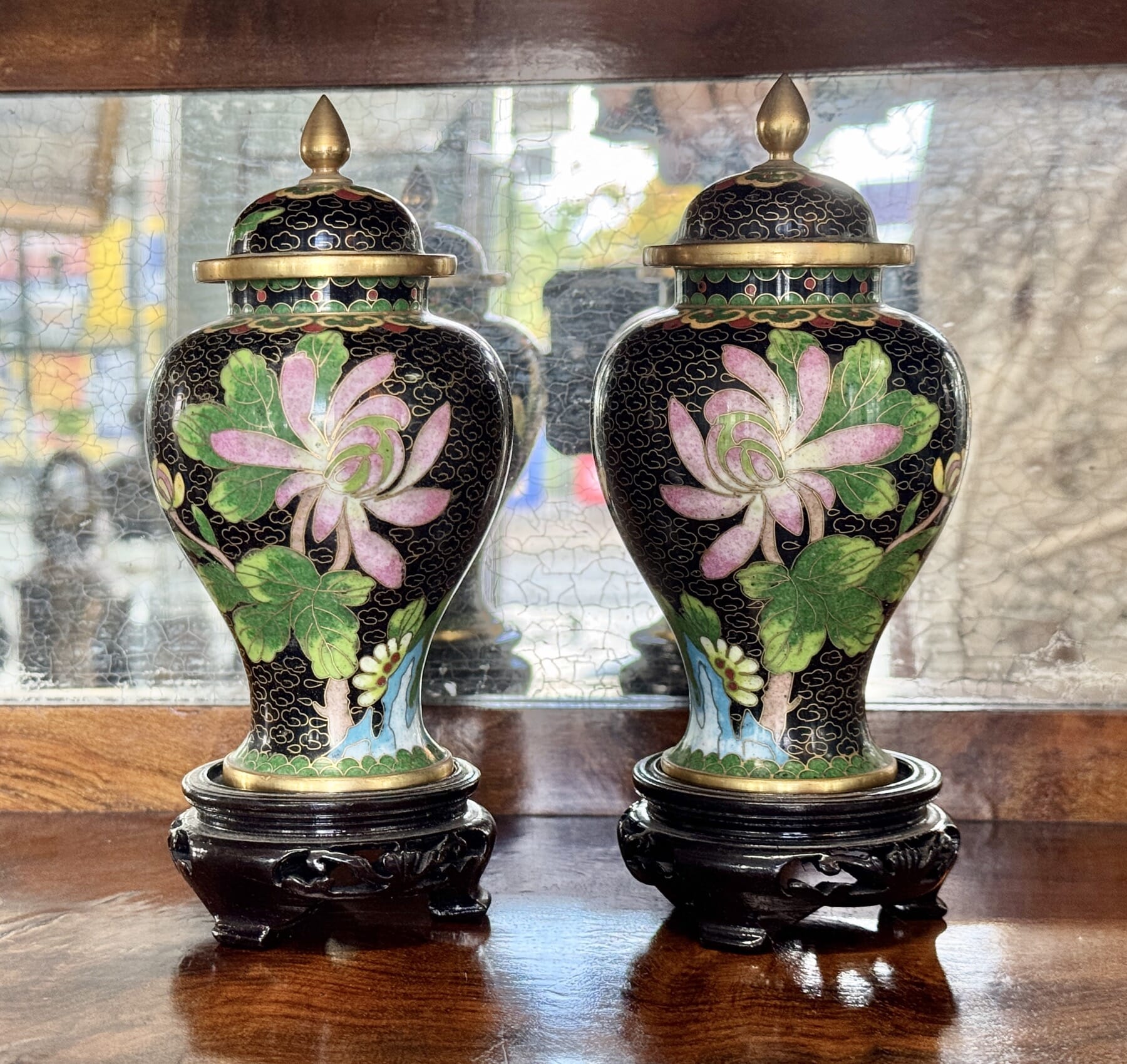Pair of Chinese Cloisonné ‘Magnolia’ lidded vases & stands, 20th century