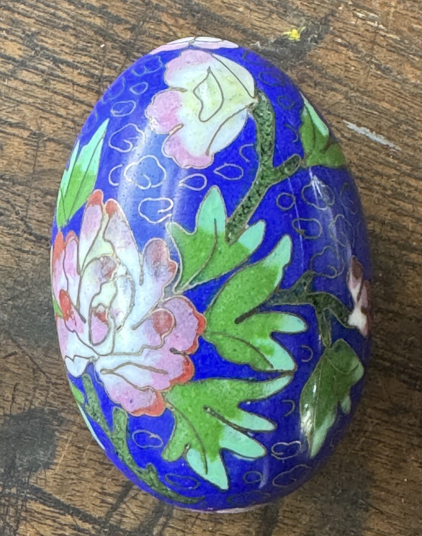 Chinese Cloisonné egg with blue ground & magnolia flowers, 20th c.