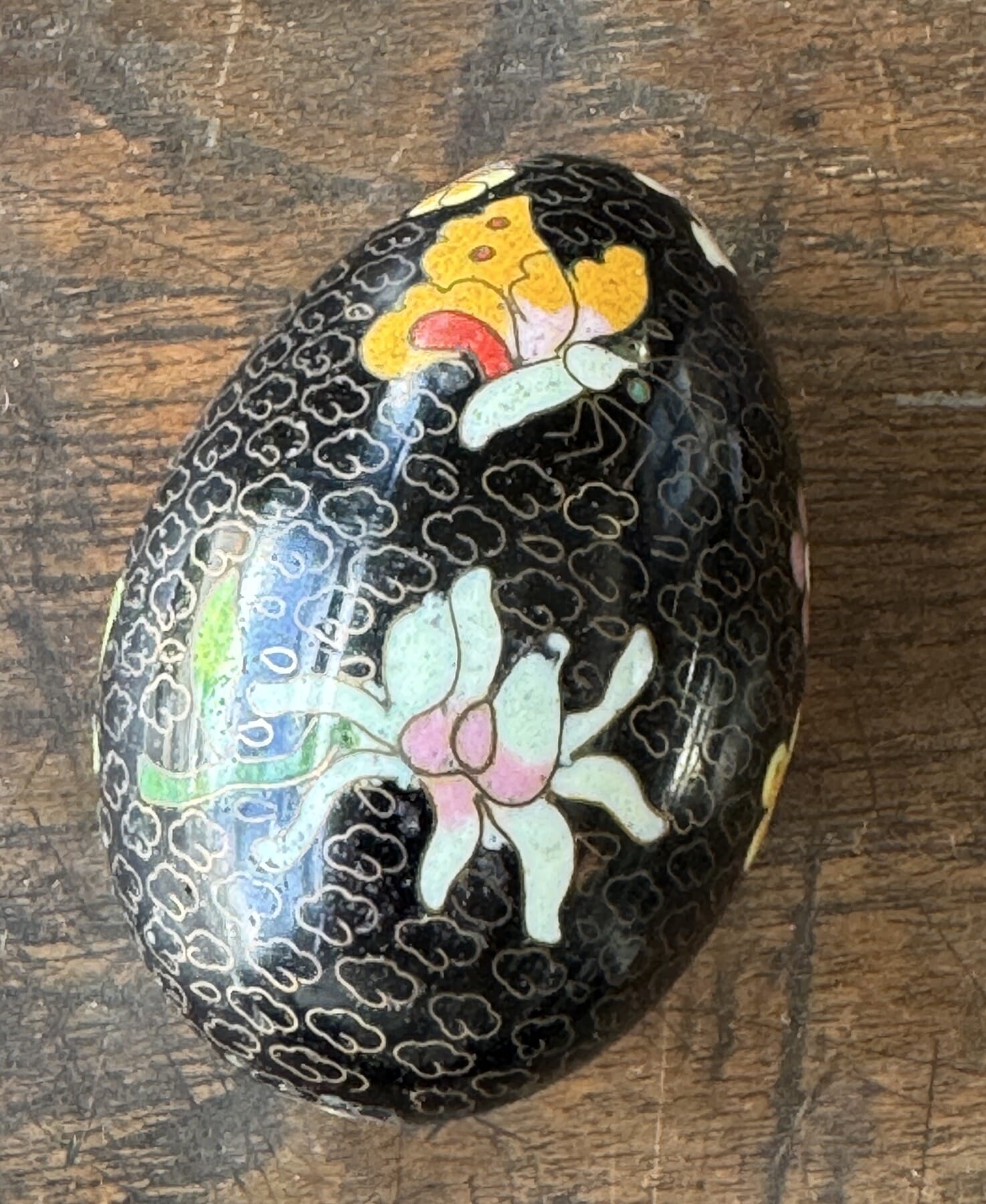 Chinese Cloisonné egg with black ground, butterfly & flowers, 20th c.