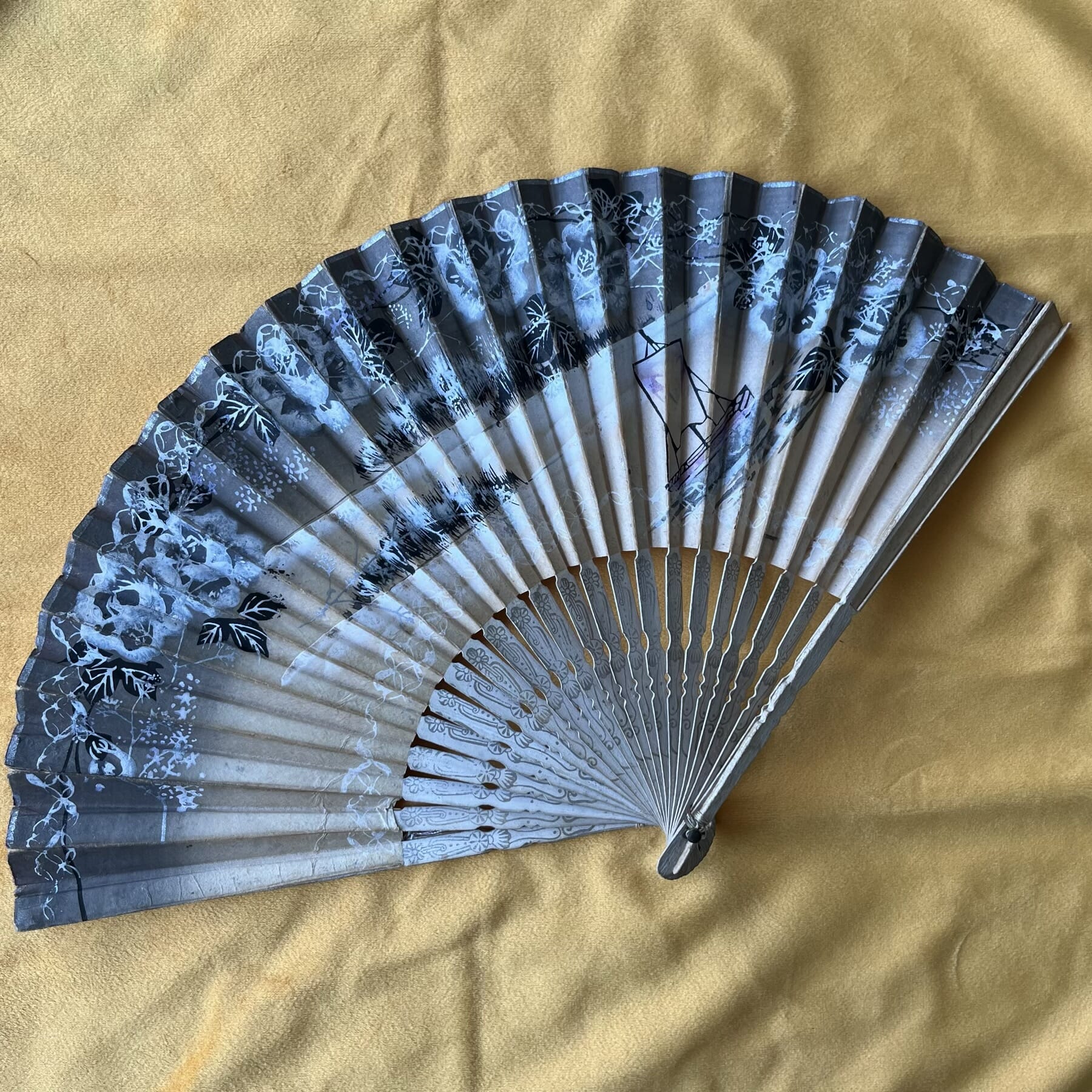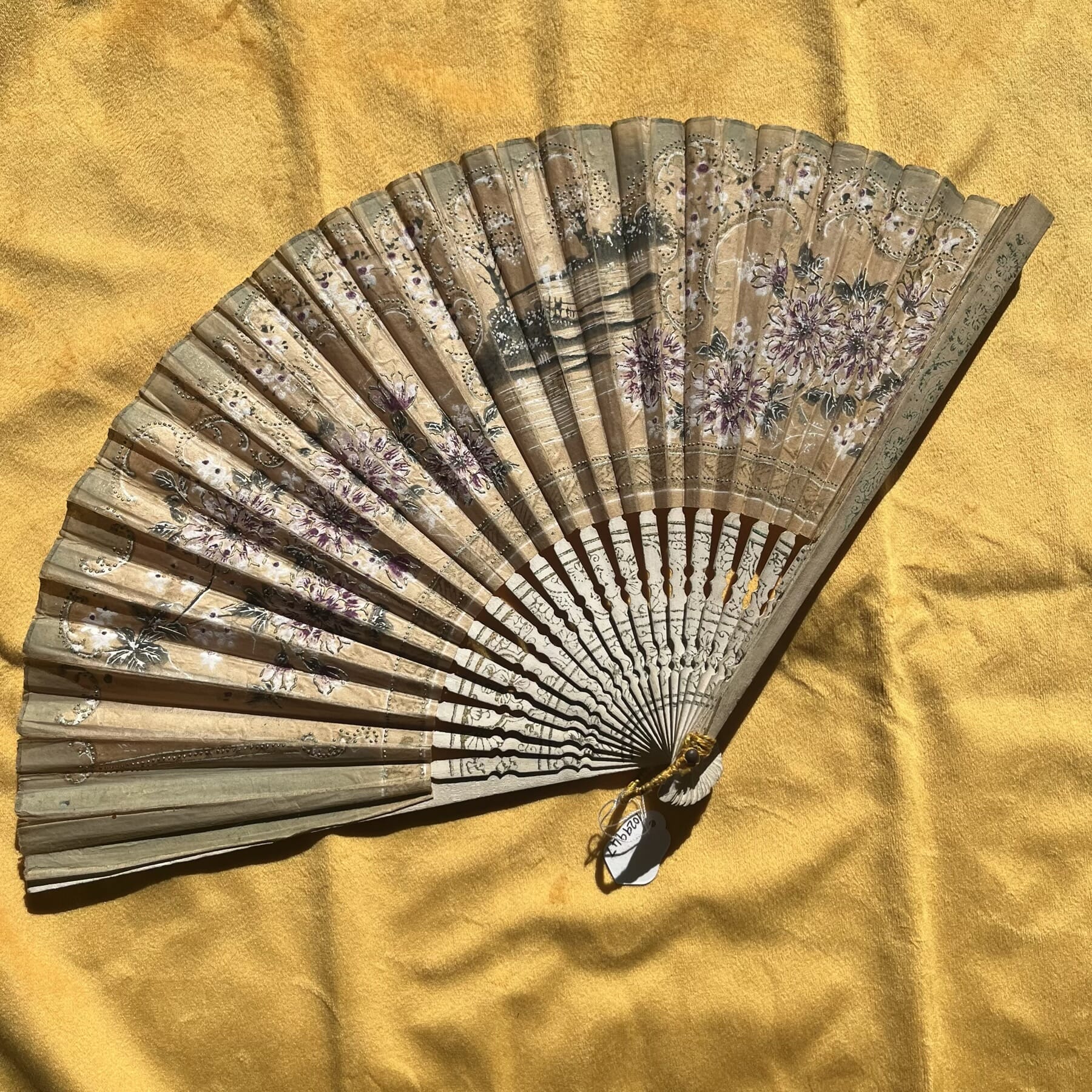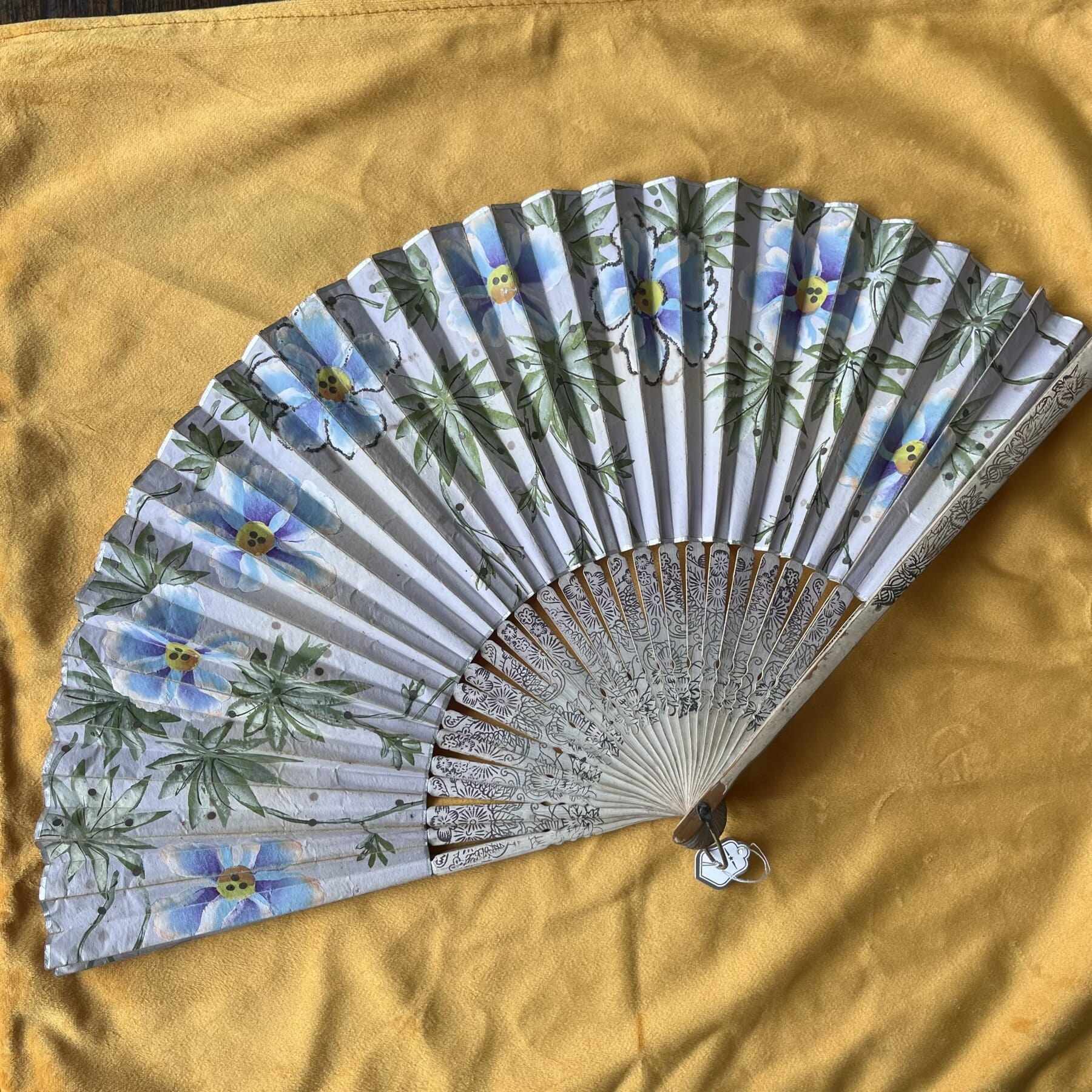 Chinese paper fan, hand painted landscape & flowers, early 20th century