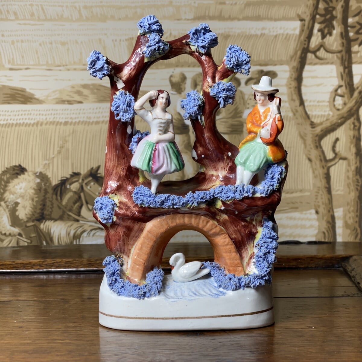 Staffordshire group, dancer, musician, bridge with swan, c.1865