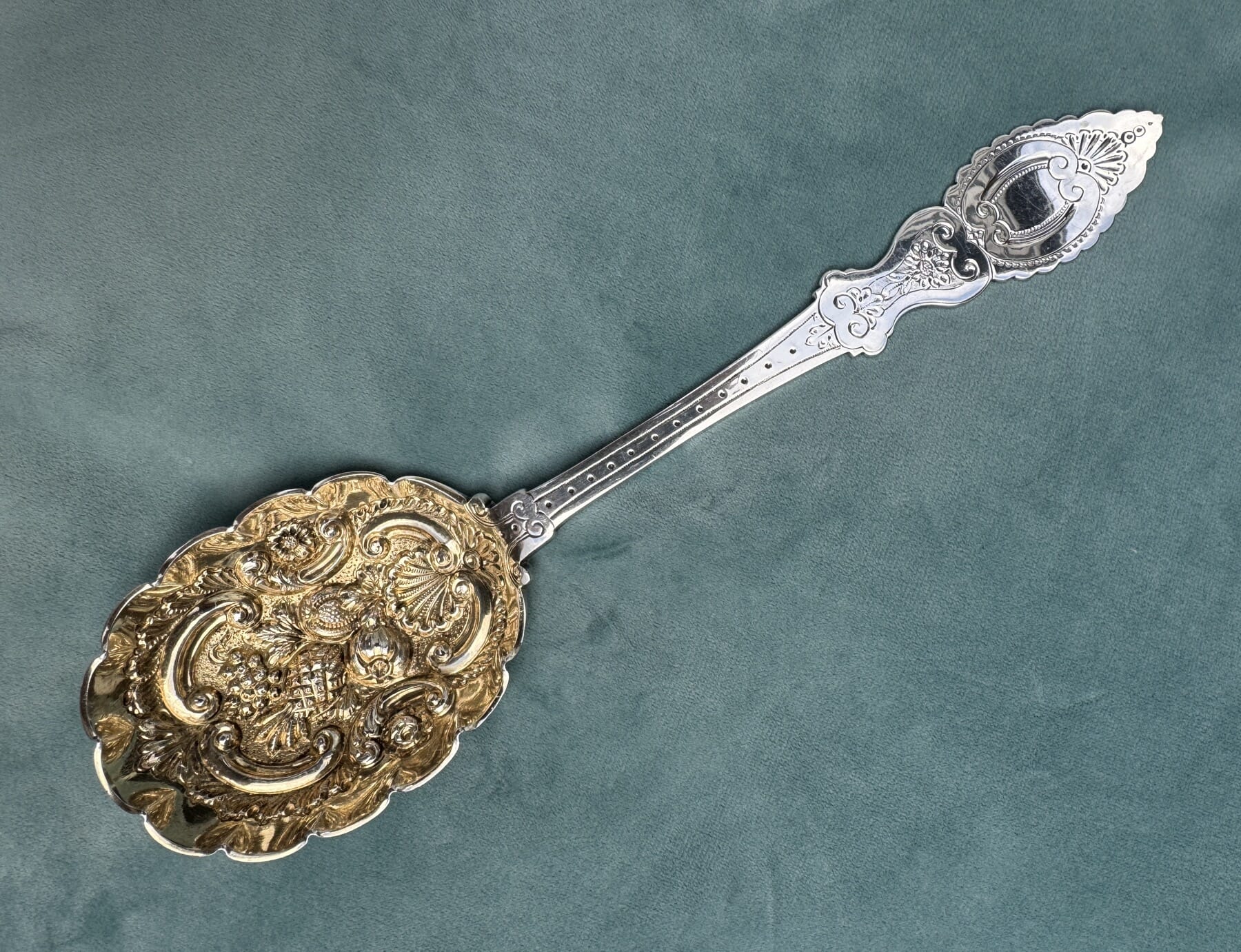 Fine quality Sterling Silver berry spoon, embossed fruit & flowers, Josiah Williams & Co, Bristol, hallmarked London 1896