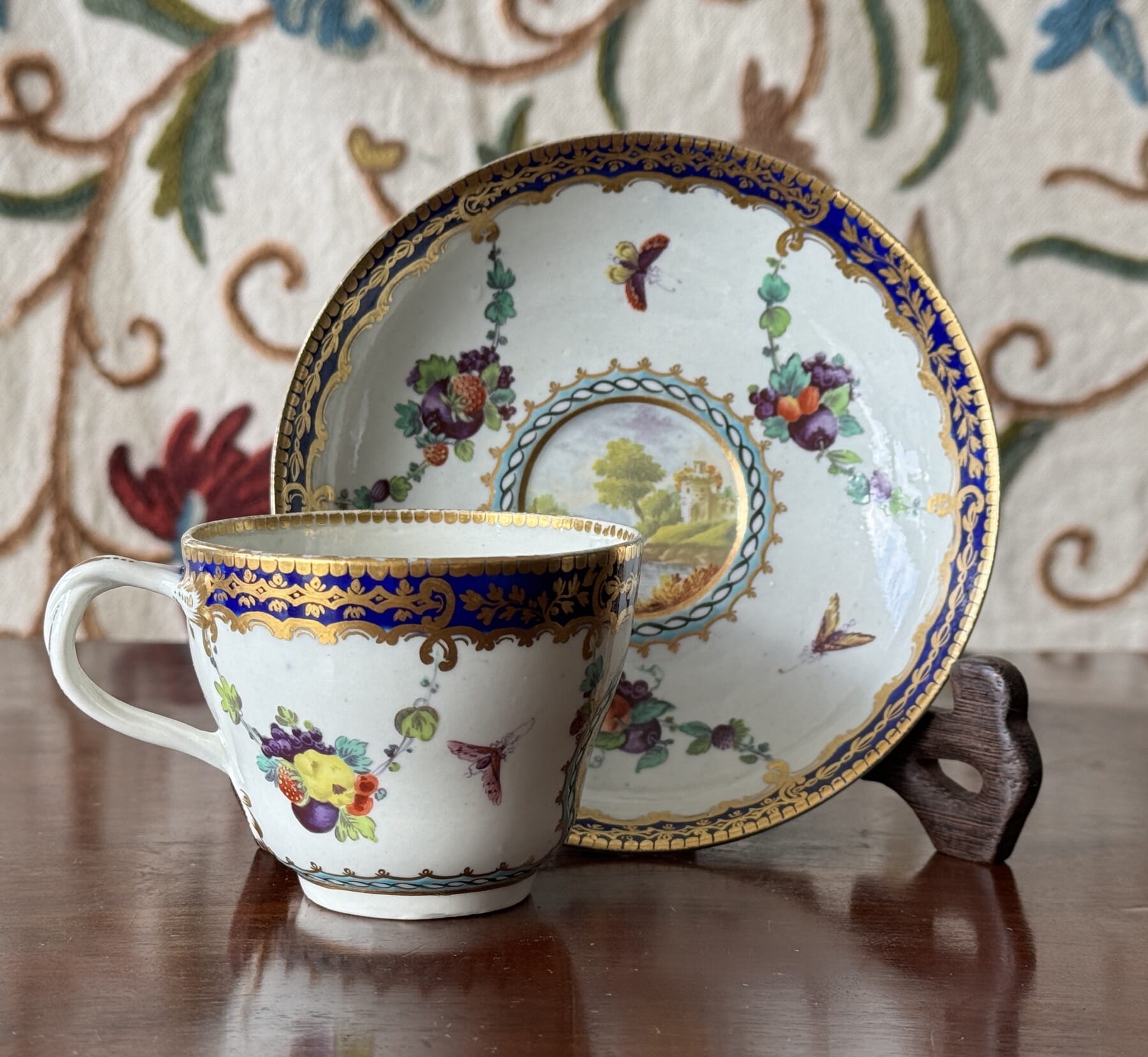 Dr Wall Worcester cup & saucer, ‘Stormont Service’, landscapes & fruit c. 1780
