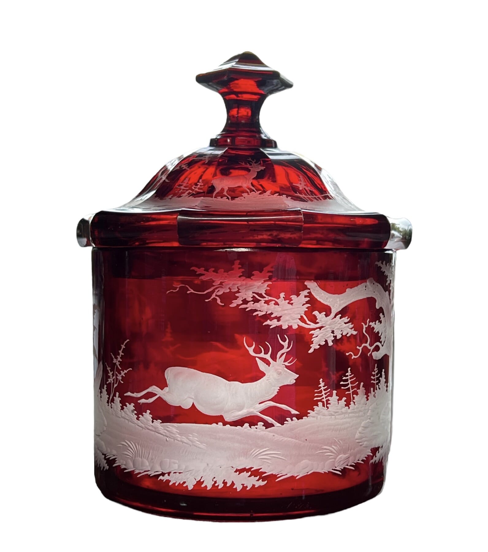 Bohemian ruby flash covered box, fine hunt landscape engraved c.1850