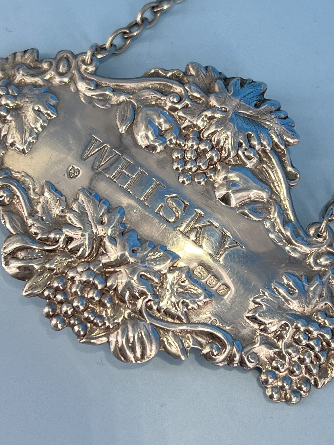 Sterling decanter label, ‘Whiskey’, fruiting vine border, London 1966