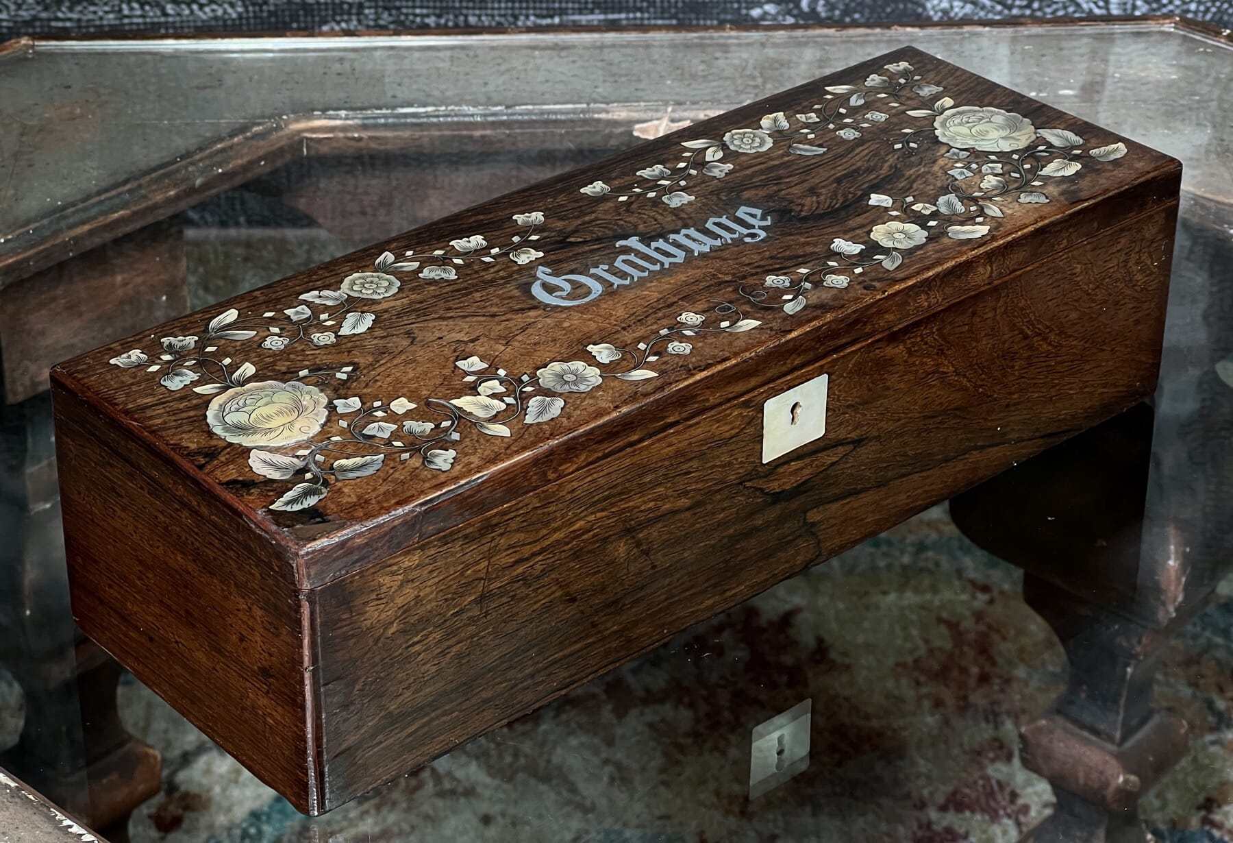 French Rosewood cards box, inlaid pearl-shell & silver flowers, ‘Grabuge’ , c. 1875