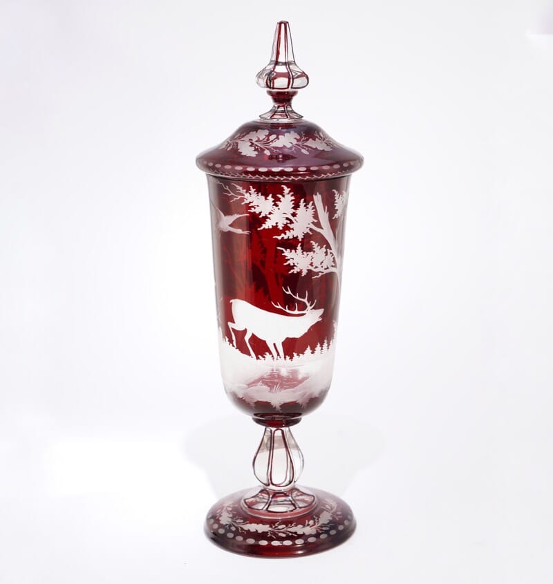 Bohemian ruby flash glass lidded vase, deer engraving, c.1880