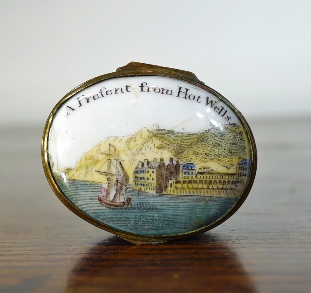 English enamel scenic patch box-A prefent from Hot Wells- c. 1790