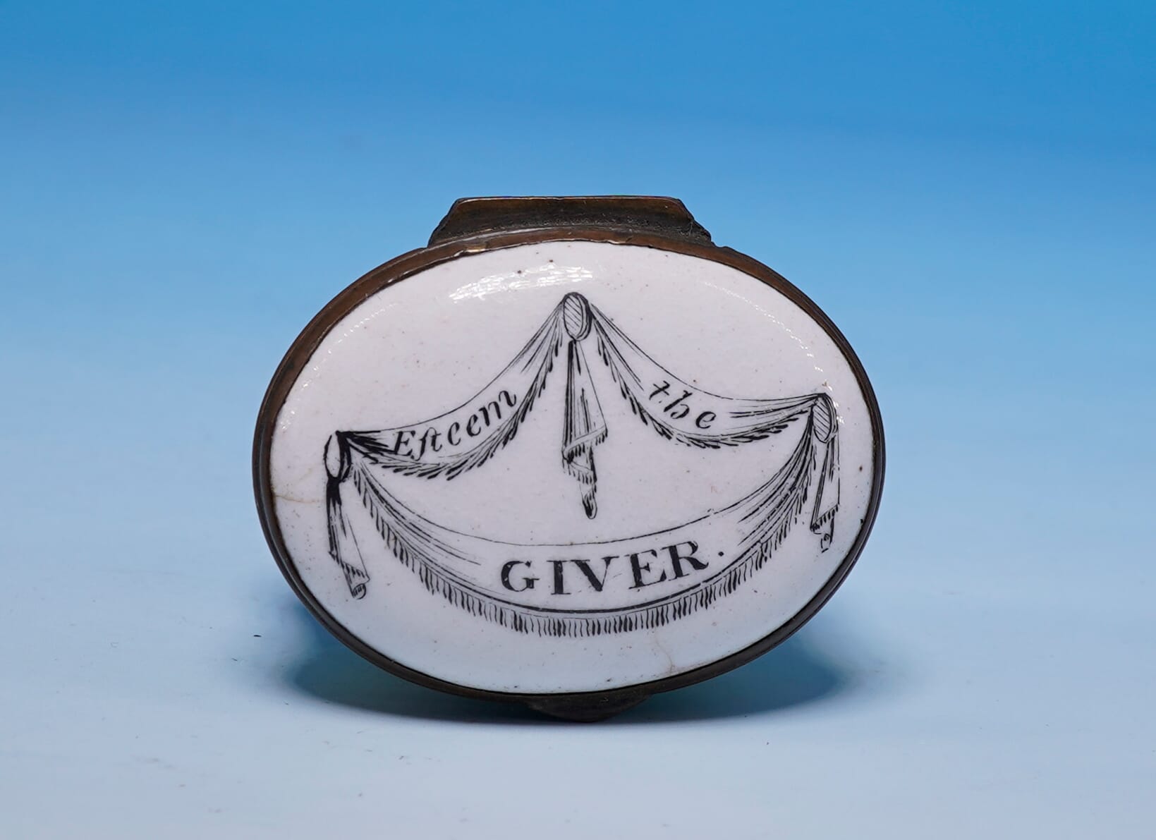 English Enamel snuff box, ‘Efteem the Giver’ on swags, c. 1780