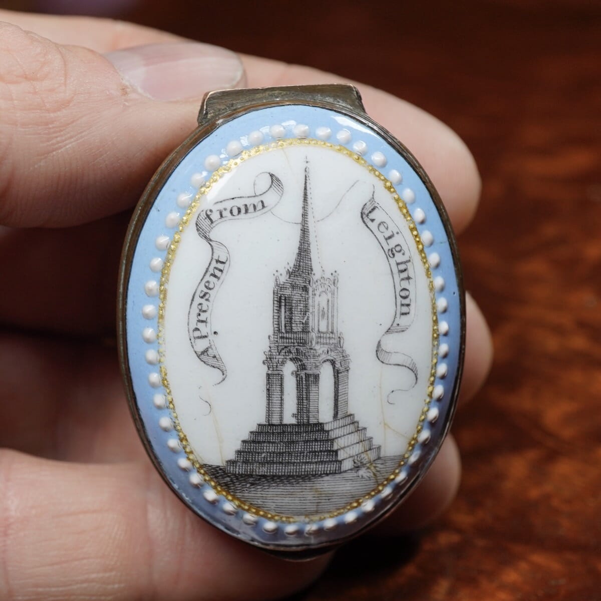 Small enamel mirrored box, scene entitled ‘A Present from Leighton’, c1790