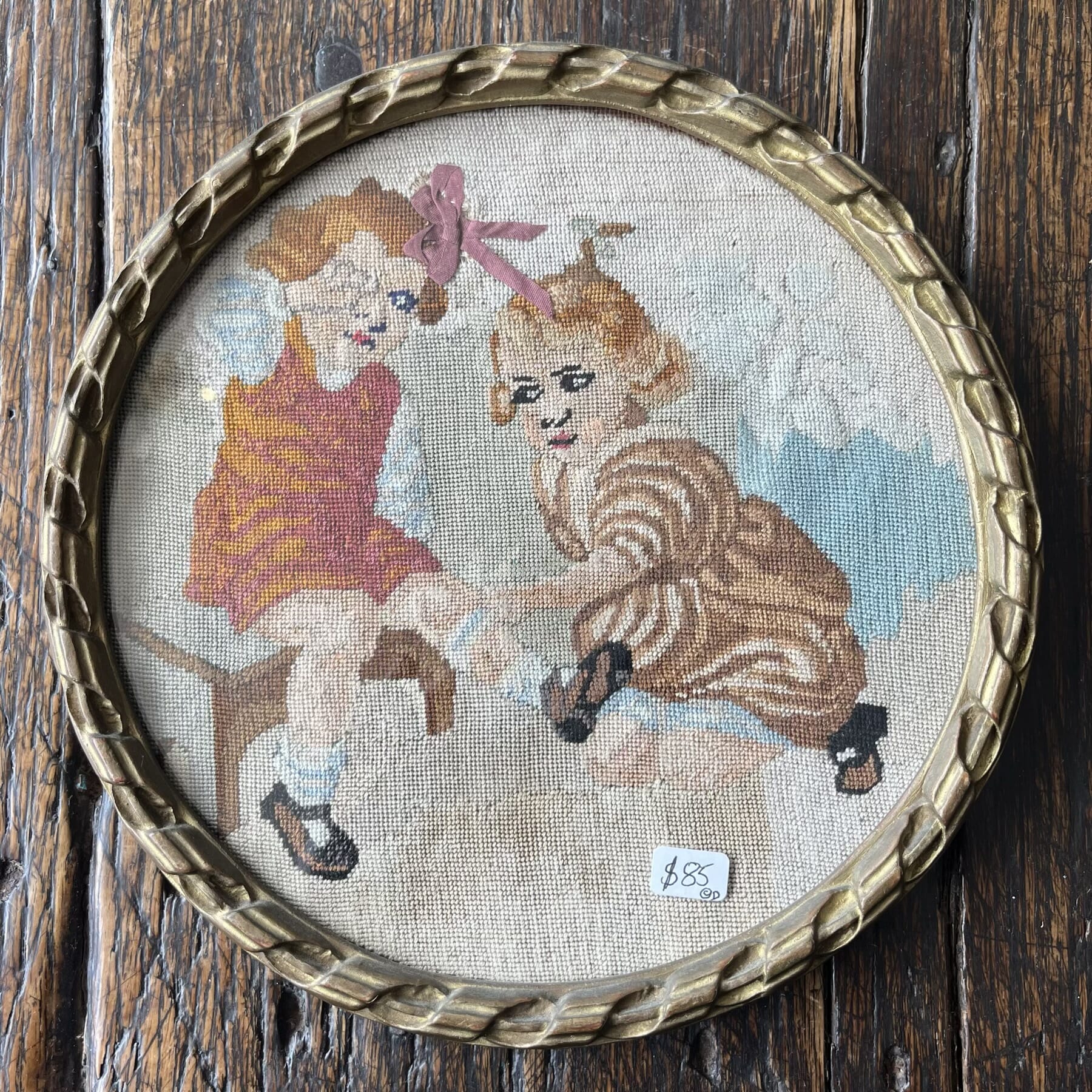 Whimsical petit-point round embroidery, ‘the hurt knee’, 1920’s