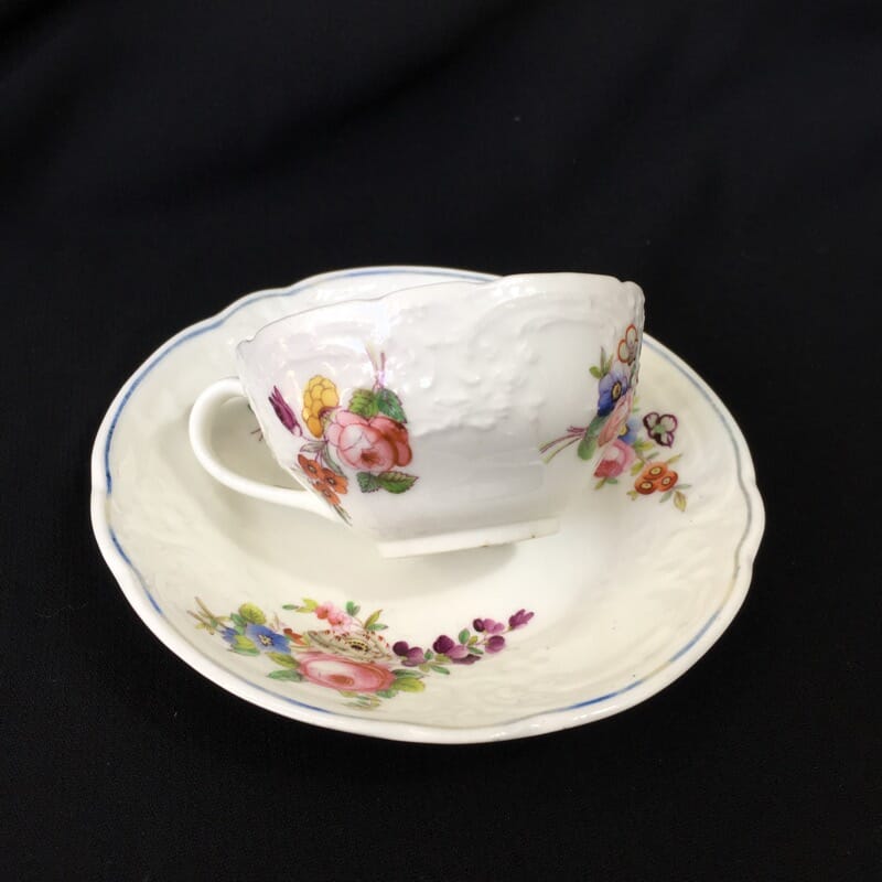 English Coalport porcelain cup and saucer, printed and painted flowers, c. 1830