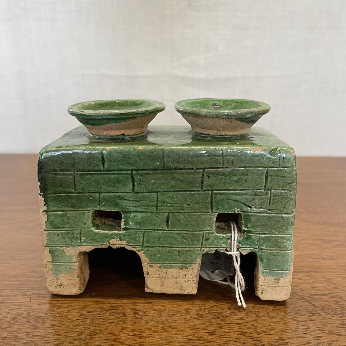 Chinese pottery model of a stove with 2 vessels, with food & implements, 2nd c. BC