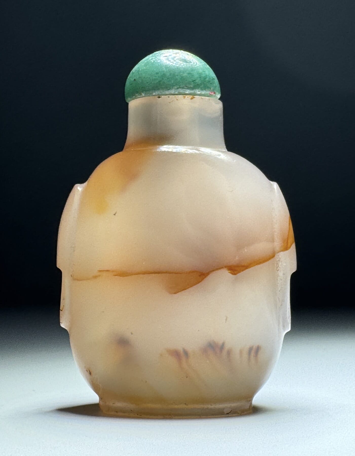 Chinese carved agate snuff bottle, malachite stopper, 19th/ early 20th century