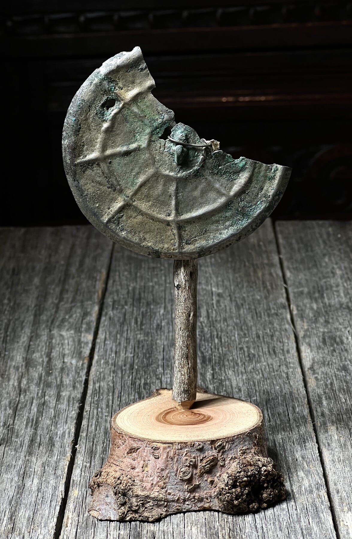 Rare European bronze mirror, silvery surface with Spider’s Web design, 8th-10th century AD