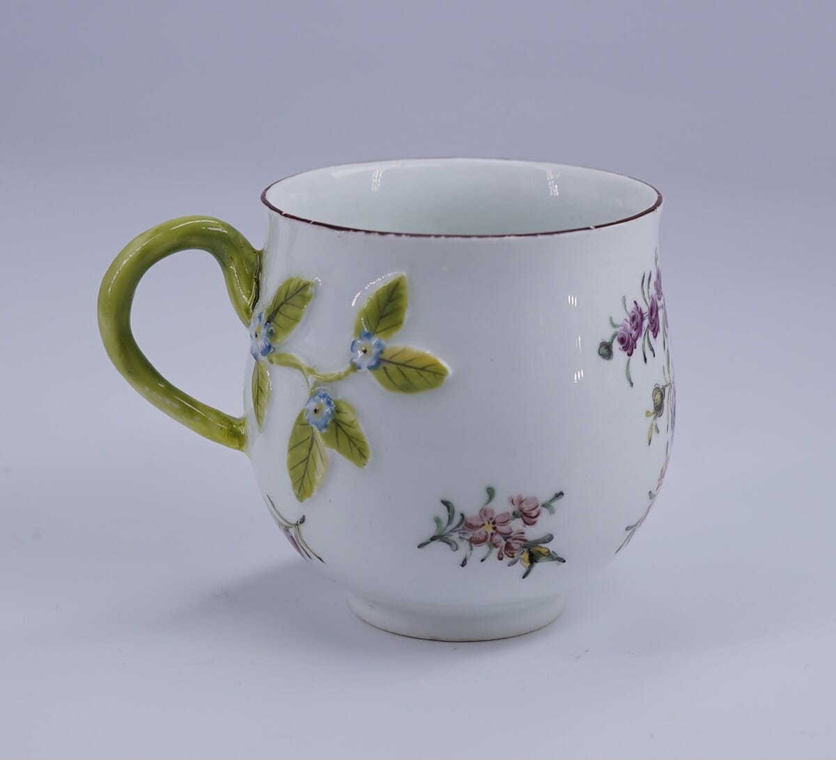 Red Anchor Chelsea cup, twig handle & Meissen style flowers, c.1754