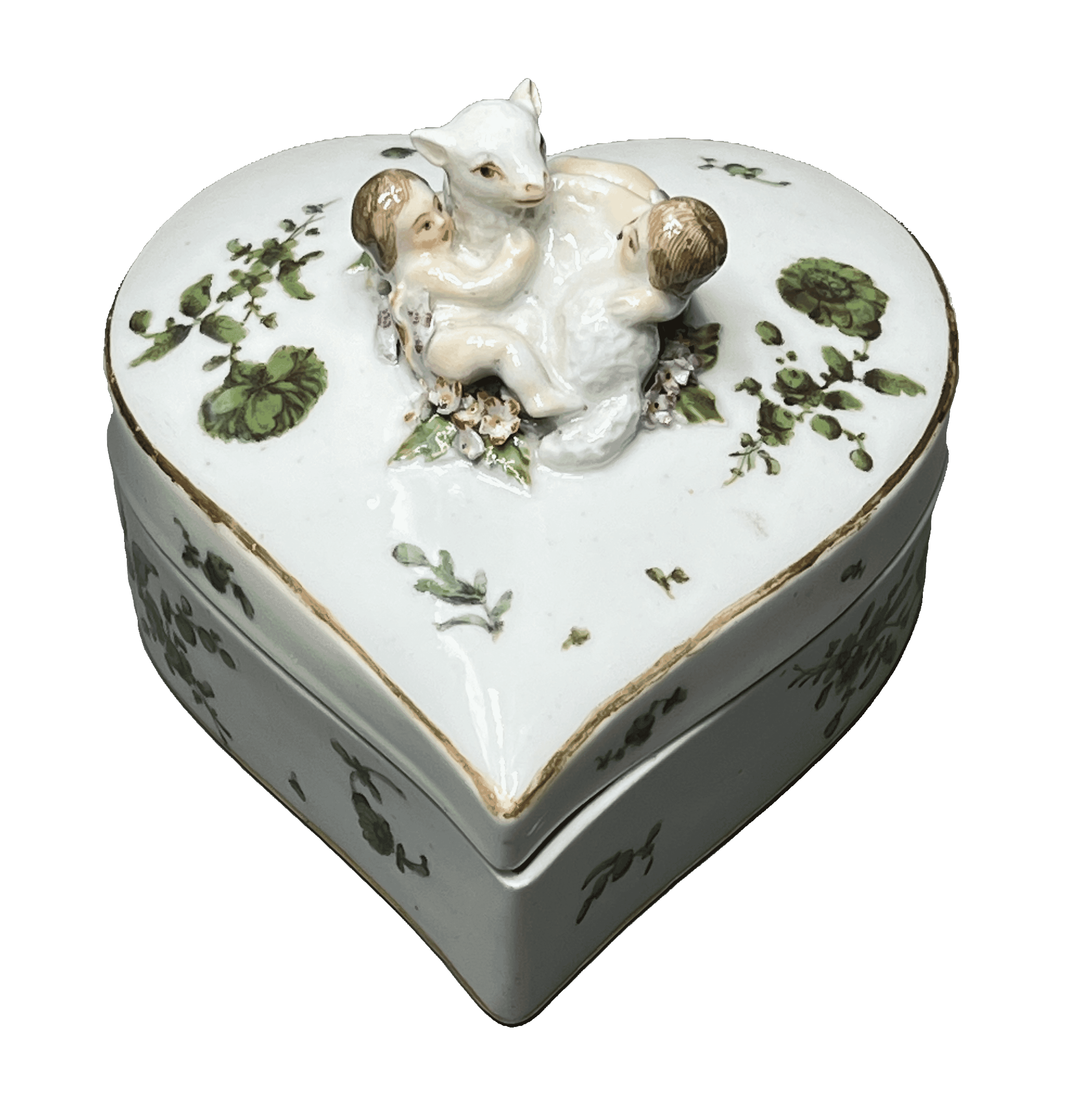 Gold Anchor Chelsea heart shaped box, topped with children & lamb figures, c.1760