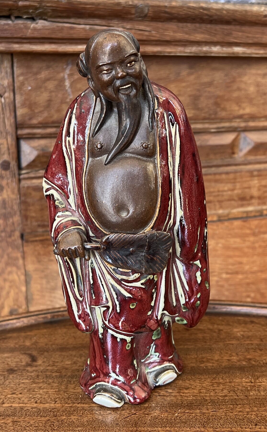 Chinese pottery figure of a sage with fan, red glaze & brown body, 20th c.
