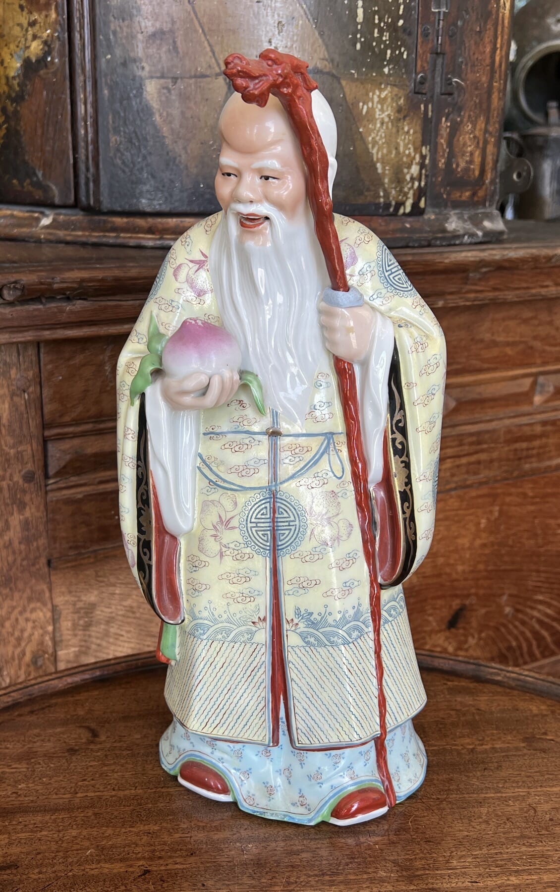 Large Chinese porcelain figure of the immortal Shou-Lao, in colourful robes, 20th C