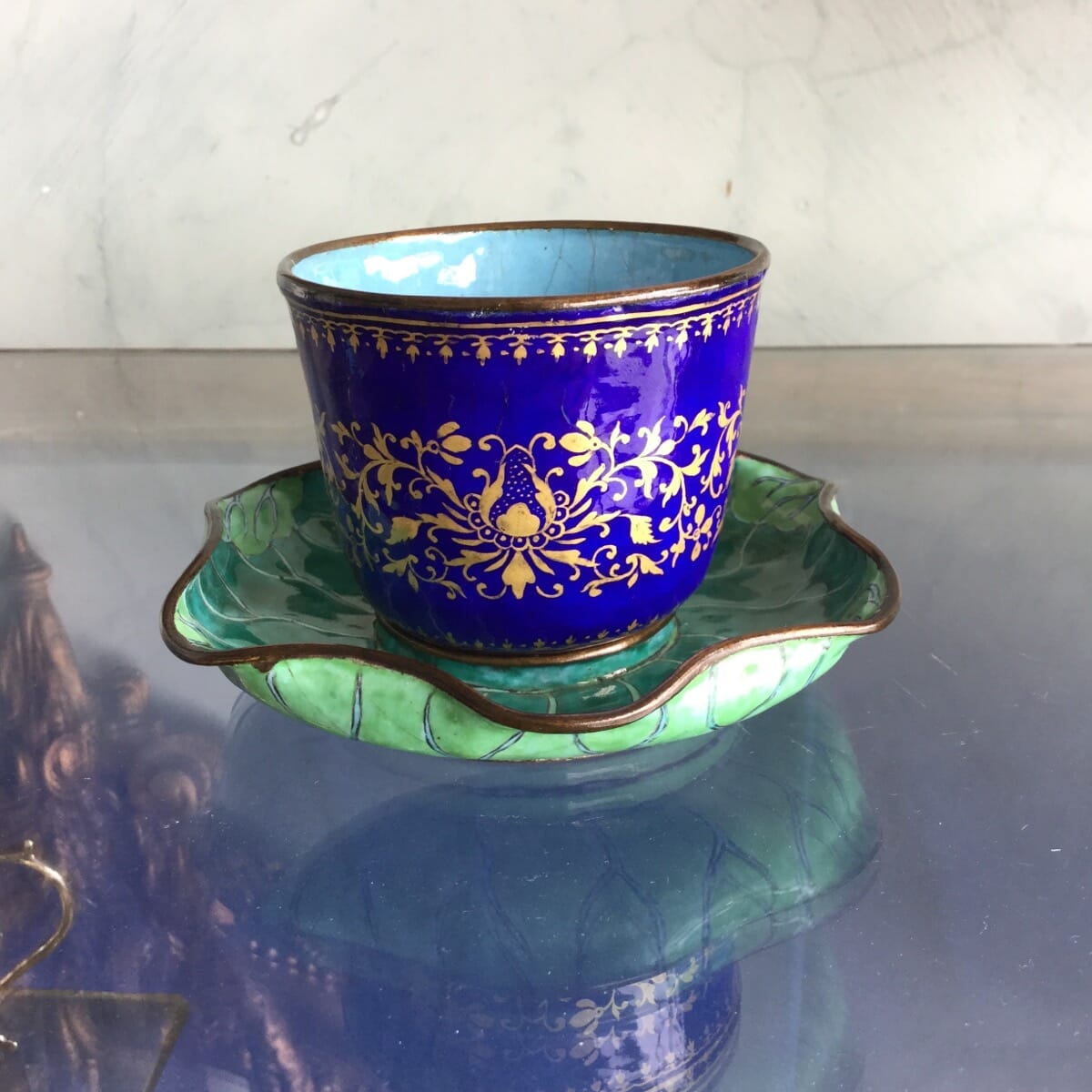 Chinese enamel cup in lotus leaf stand, 18th century