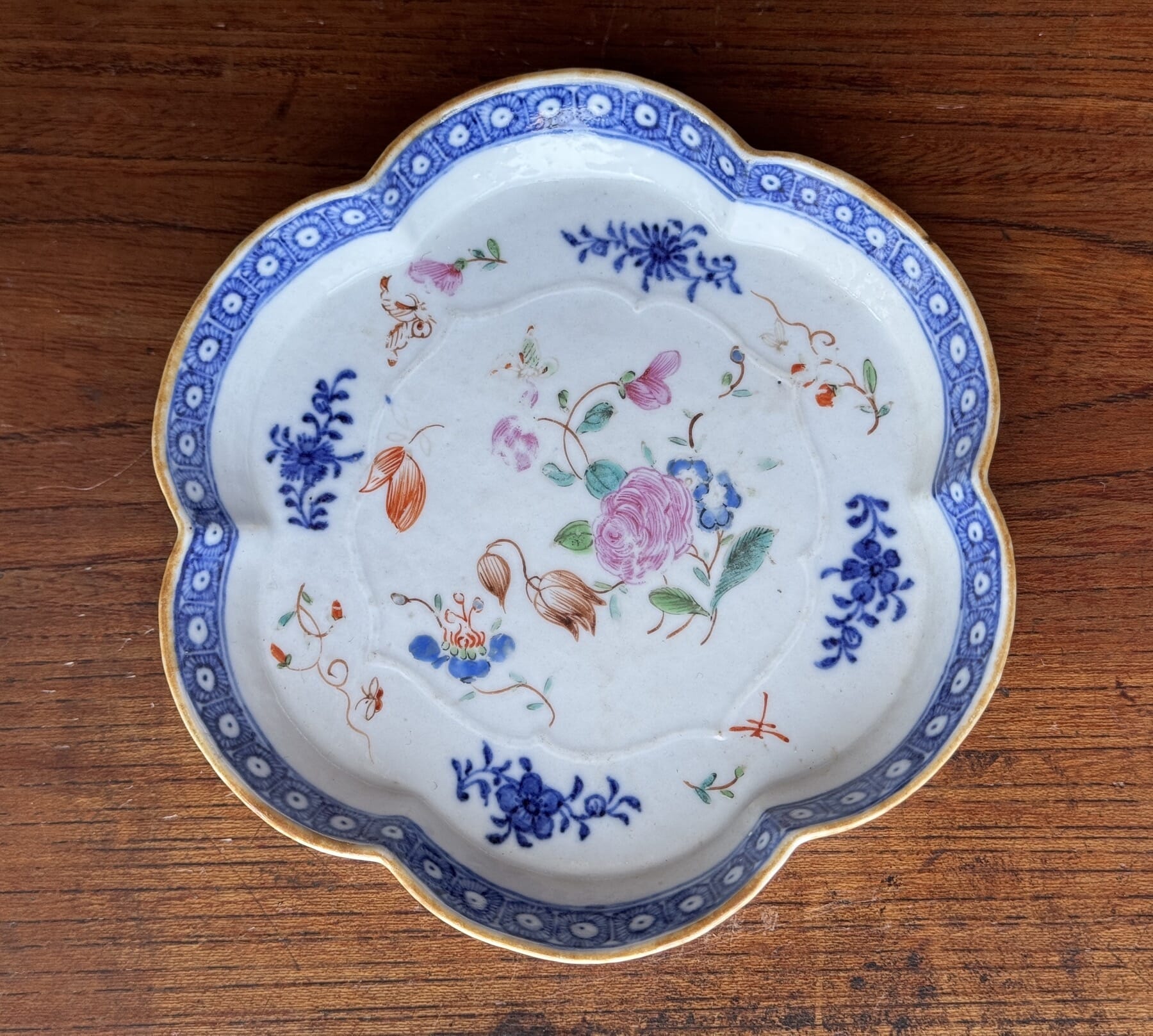Chinese Export teapot stand with underglaze blue flowers, added enamel flowers, c. 1765