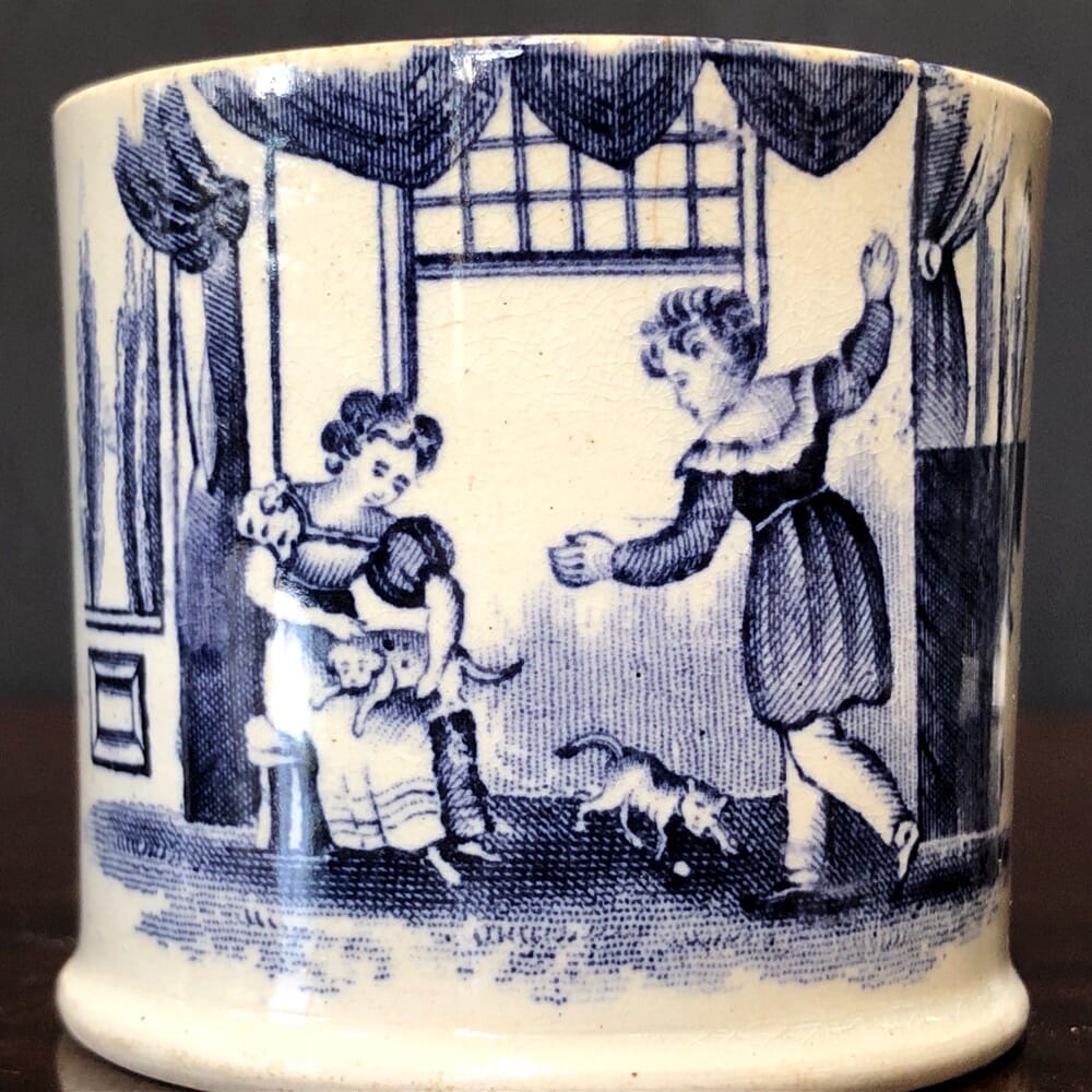 English pottery Children’s mug, Playing with Cat & Dog, c. 1830#1023368View item