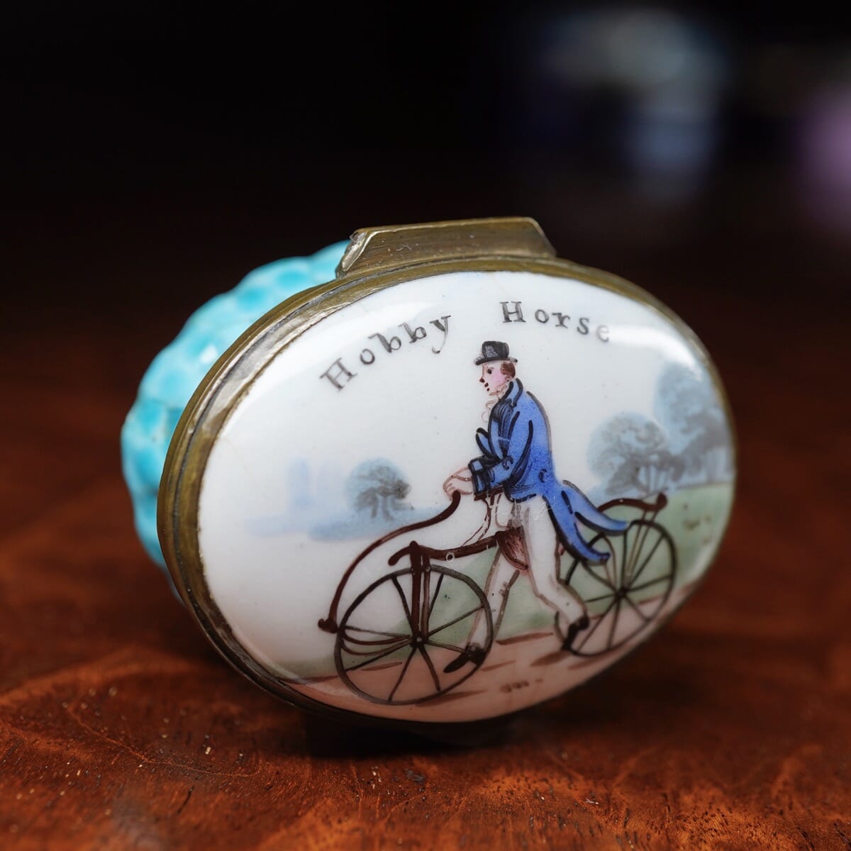 Rare English enamel patch box, ‘Hobby-Horse’, c. 1815